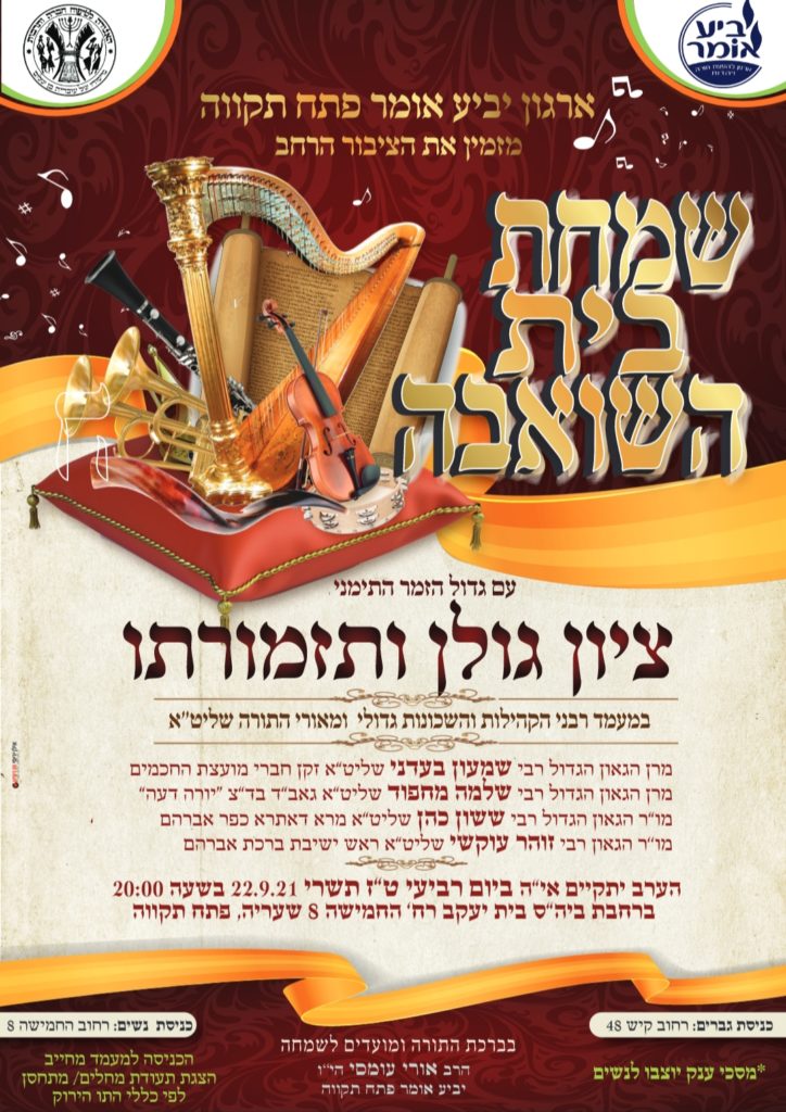 פתח תקוה: שמחת בית השואבה המסורתית עם גדולי הרבנים יחד עם גדול הזמר התימני ציון גולן | יום רביעי ט"ז תשרי ב' דחול המועד סוכות תשפ"ב – 22/9/2021 | כל הפרטים במודעה שלפניכם