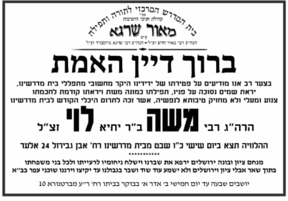 אבל בראש העין: הלך לעולמו חבר מועצת העיר לשעבר ומראשי הכולל – הרב משה לוי זצ"ל | ביום שישי האחרון הלך לעולמו הרב משה לוי זצ"ל, ונטמן בבית העלמין סגולה פ"ת