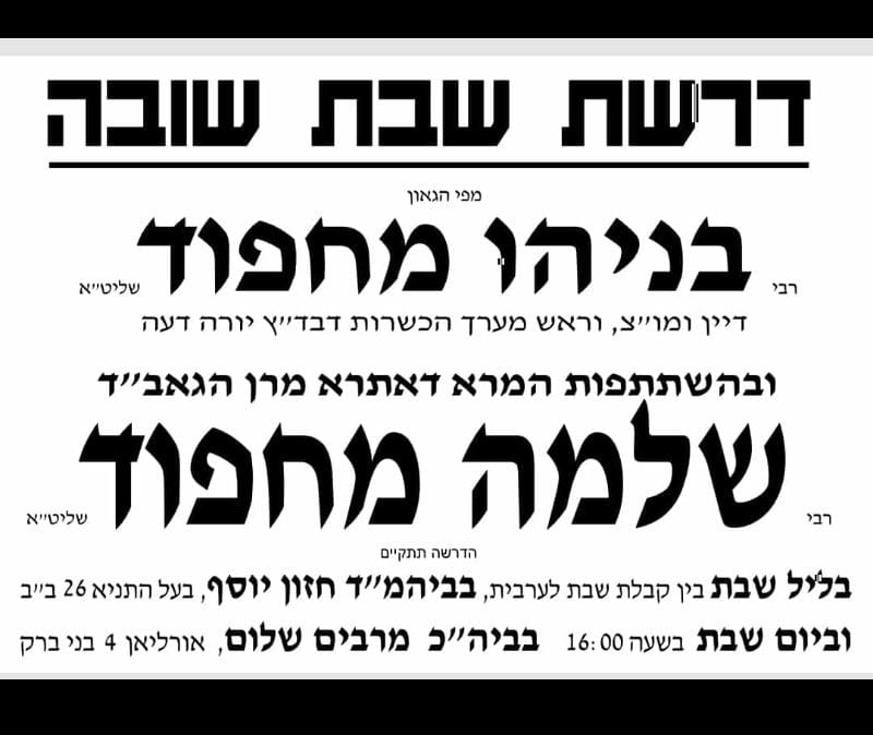 לראשונה: דרשת שבת שובה במעמד מרן הגאון רבי שלמה מחפוד שליט"א, אשר עקב חולשתו הרבה עקב החלמתו מחוליו בחסדי שמים, תימסר ע"י בנו ראש מערך הכשרות של בד"ץ יורה דעה ודומ"ץ, הגאון רבי בניהו מחפוד שליט"א, בביהמ"ד חזון יוסף רחוב בעל התניא 26 ב"ב, בין קבלת שבת לערבית. ובביהמ"ד מרבים שלום רחוב אורליאן 4 ב"ב, בשעה 16.00 ביום השבת. הציבור נקרא להשתתף להגדיל תורה ולהאדירה.