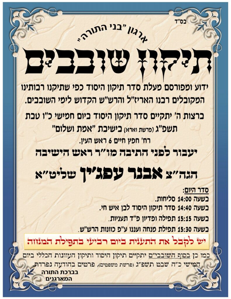 תיקון שובבי"ם עם המקובל הגאון רבינו אבנר עפגי'ן שליט"א | יום חמישי הקרוב כ"ו טבת תשפ"ג, בשעה 14.00 בצהרים בדיוק, בהיכל ישיבת אמת ושלום רחוב חפץ חיים 6 ראש העין | כל הפרטים