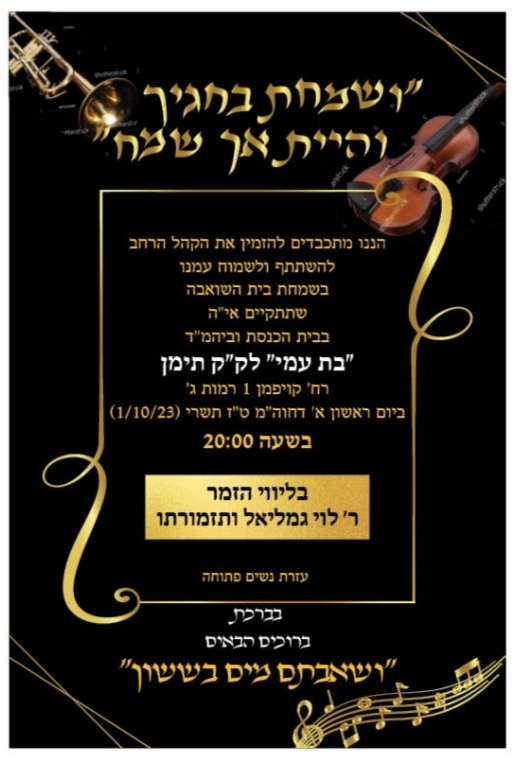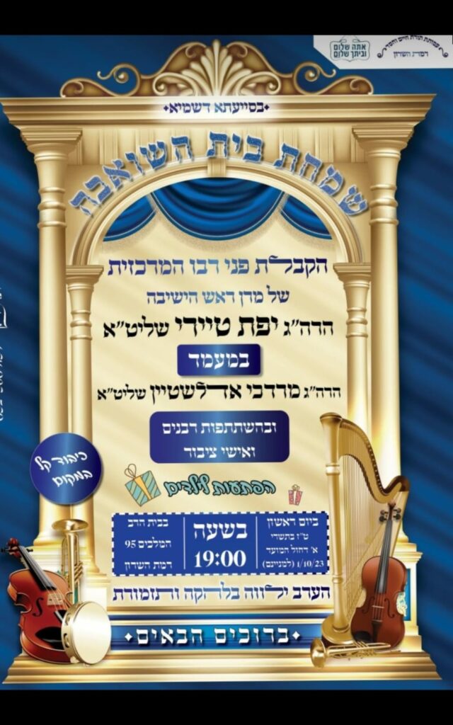 ביתר עילית: במוצאי יו"ט ראשון שמחת החג המרכזית של כלל הקהילות בעיר בראשות הראב"ד הגר"י מועלם, באולם שע"י ביה"כ בני תורה רחוב המגיד ממעזריטש 33 ביתר עילית, בשעה 20.00 בערב, בליווי תזמורת.