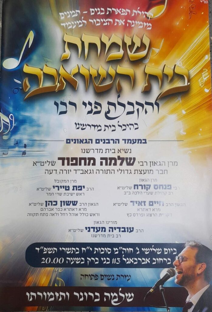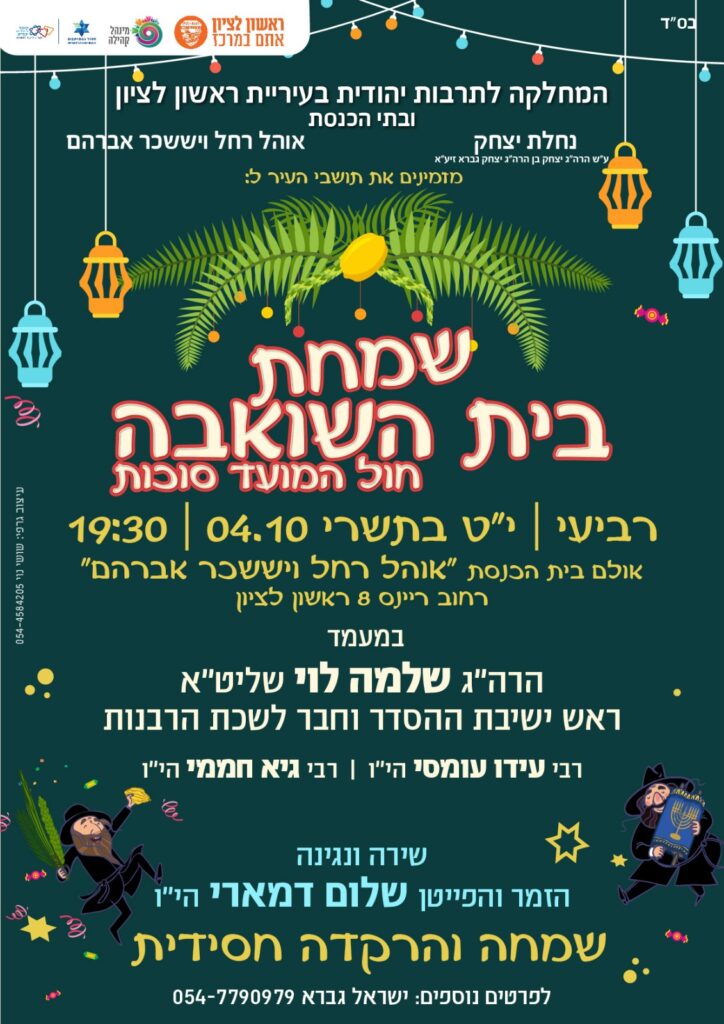 נס ציונה: שמחת בית השואבה ושמחת החג המרכזית, תיערך מחר יום רביעי ד' דחול המועד סוכות – בסוכת ראש המוסדות הגאון רבי יהורם יפת שליט"א | בליווי תזמורת וכלי נגינה | כיבוד עשיר בשפע | במעמד רבנים נכבדים ואישי ציבור | רחוב ויצמן 17 נס ציונה. בשעה 18.00 – תפילת מנחה.