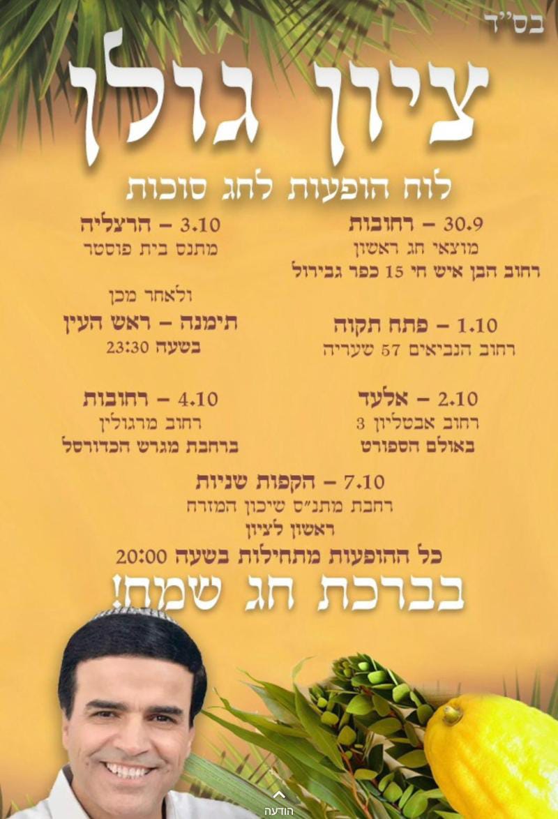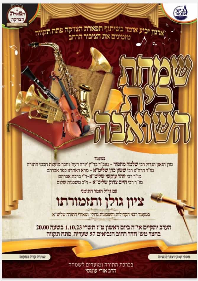 פתח תקוה: שמחת החג של ארגון 'תפארת הצדקה' עם הזמר ציון גולן, תיערך בבית מש' חדד רחוב הנביאים 57 שערייה פ"ת, החל מהשעה 20.00. מסכים יוצבו לנשים. כיבוד קל. בהשתתפות גדולי הרבנים.