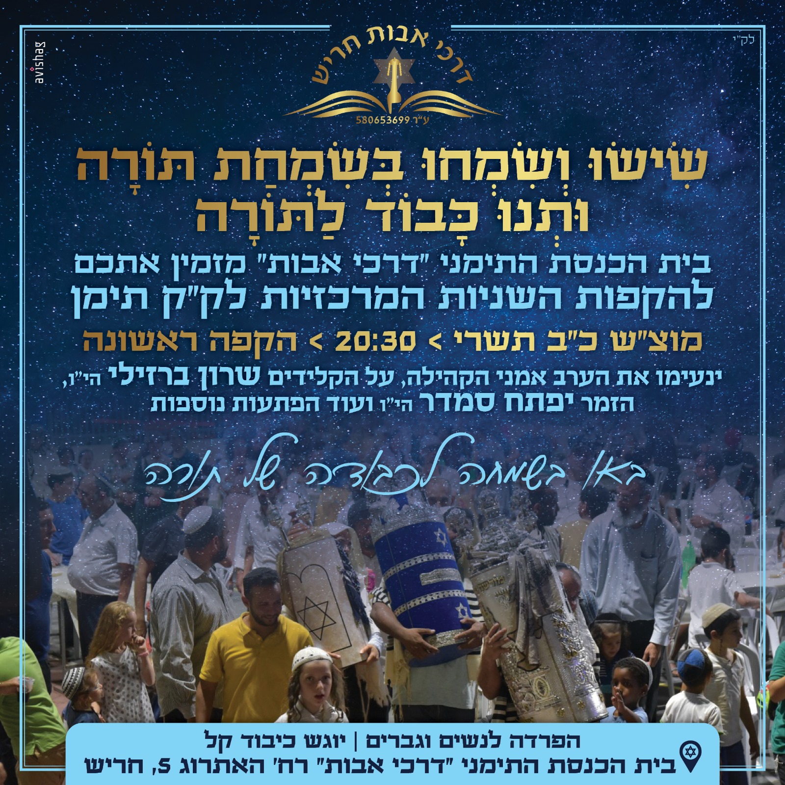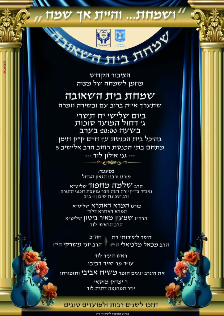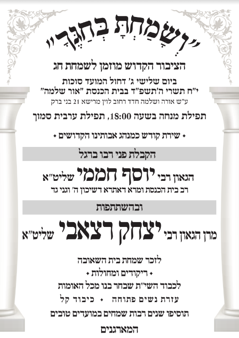 אחיסמך: שמחת החג בהיכל ביה"כ עץ חיים רחוב הרב אלישיב 5 שכונת אחיסמך לוד, החל מהשעה 20.00. בהשתתפות גדולי הרבנים והזמר משיח אביבי.