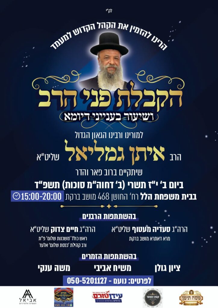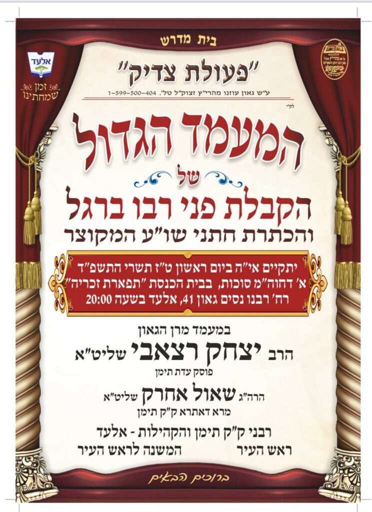 אלעד: מעמד הקבלת פני רבו להגאון רבי יצחק רצאבי, יערך בביה"כ תפארת זכריה רחוב רבינו ניסים גאון 41 אלעד, החל מהשעה 20.00 בערב.