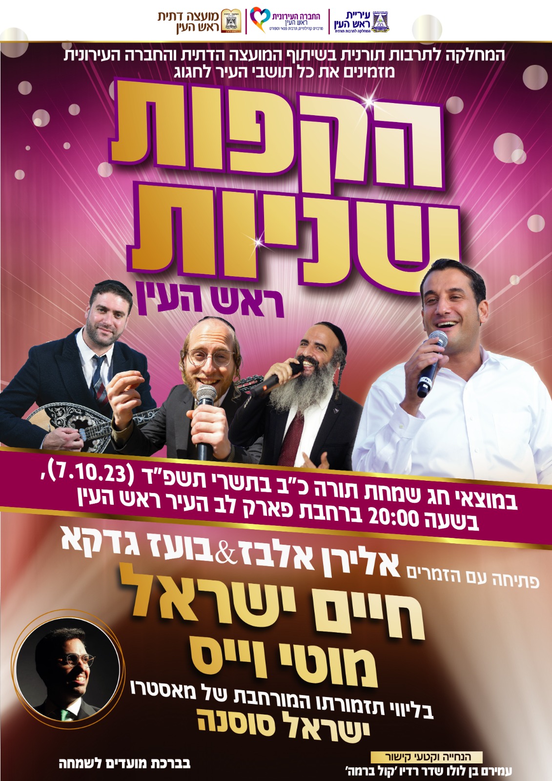 ראש העין: הקפות שניות מרכזי יערך ברחבת הפארק העירוני לב העיר, החל מהשעה 20.00 בערב, עם הזמרים בועז גדקה, חיים ישראל, מוטי וייס ואלירן אלבז, וישראל סוסנה ועוד.