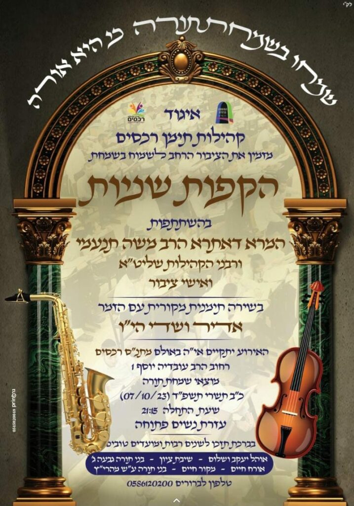 אלעד: שמחת הקפות שניות המרכזית באולם שע’’י בית הכנסת מקום מקדש רחוב יוסף קארן 5 אלעד. מוצאי שמחת תורה החל מהשעה 21.00 בערב. בליווי תזמורת וכיבוד קל. בהשתתפות ובראשות מרנן ורבנן גדולי ומאורי התורה ורב ק’’ק תימן באלעד הגר’’ב עוקשי. הציבור הקדוש מוזמן!
