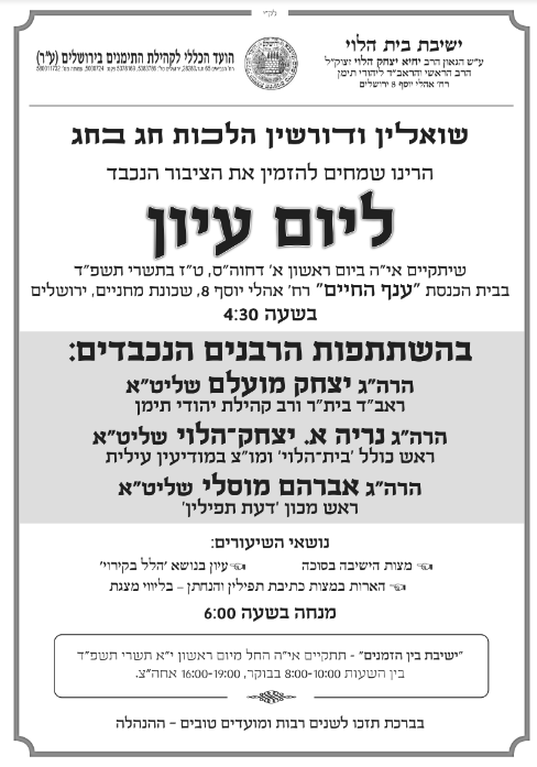 ירושלים: יום עיון ושמחת חג כמיטב המסורת, בהיכל ישיבת בית הלוי רחוב אהלי יוסף 8 ירושלים, בהשתתפות הגר"י מועלם והגר"נ הלוי ועוד רבנים נכבדים. החל מהשעה – 16.30.