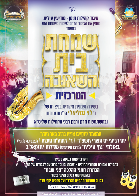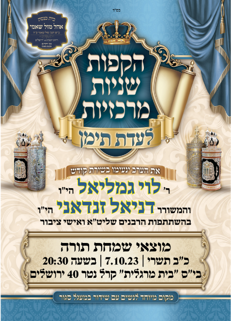 בני ברק: שמחת החג המרכזית באולמי היכלי מלכות רחוב שלמה המלך 29 בני ברק, בהשתתפות גדולי רבני תימן שליט"א, החל מהשעה 20.00 בערב. בליווי תזמורת מורחבת.