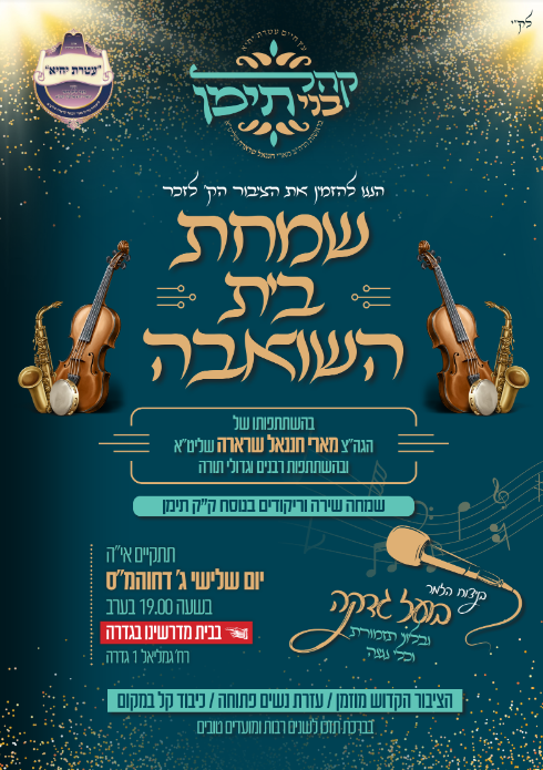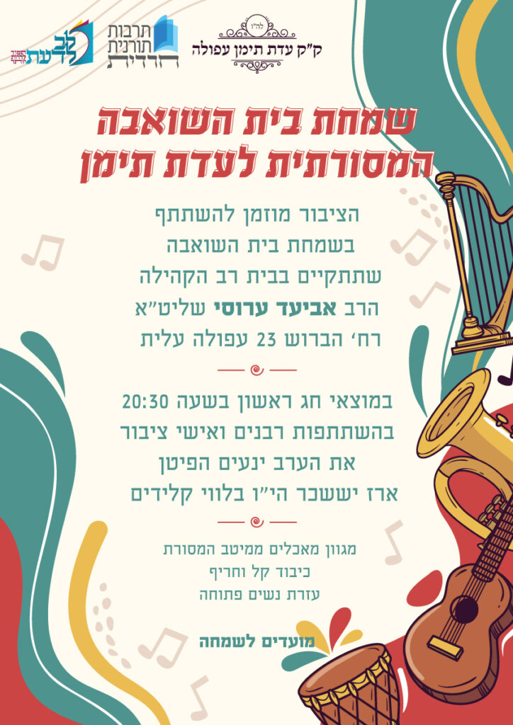 מודיעין עילית: שמחת חג מרכזית לכלל קהילות קודש תימן, תיערך באולמי נוף עילית, החל מהשעה 20.00. עם לוי גמליאל ותזמורתו.