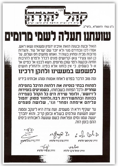 "הואיל ובעת ובעונה הזאת אויבינו יהמיון ומשנאינו נשאו ראש, אמרו לכו ונכחידם מגוי ולא יזכר שם ישראל עוד, והצרות מרובות מבית ומחוץ בעוה"ר, ואנחנו מחשים חס ושלום על כן הננו צעיר צאן קדושים פונים לכלל ולפרט להרבות תחינה ובקשה לפני שוכן מרומים, נשא לבבנו אל כפיים אל א-ל בשמים, כי אין כוחנו אלא בפינו. ולהחלץ חושים, לפשפש במעשינו ולתקן דרכינו".