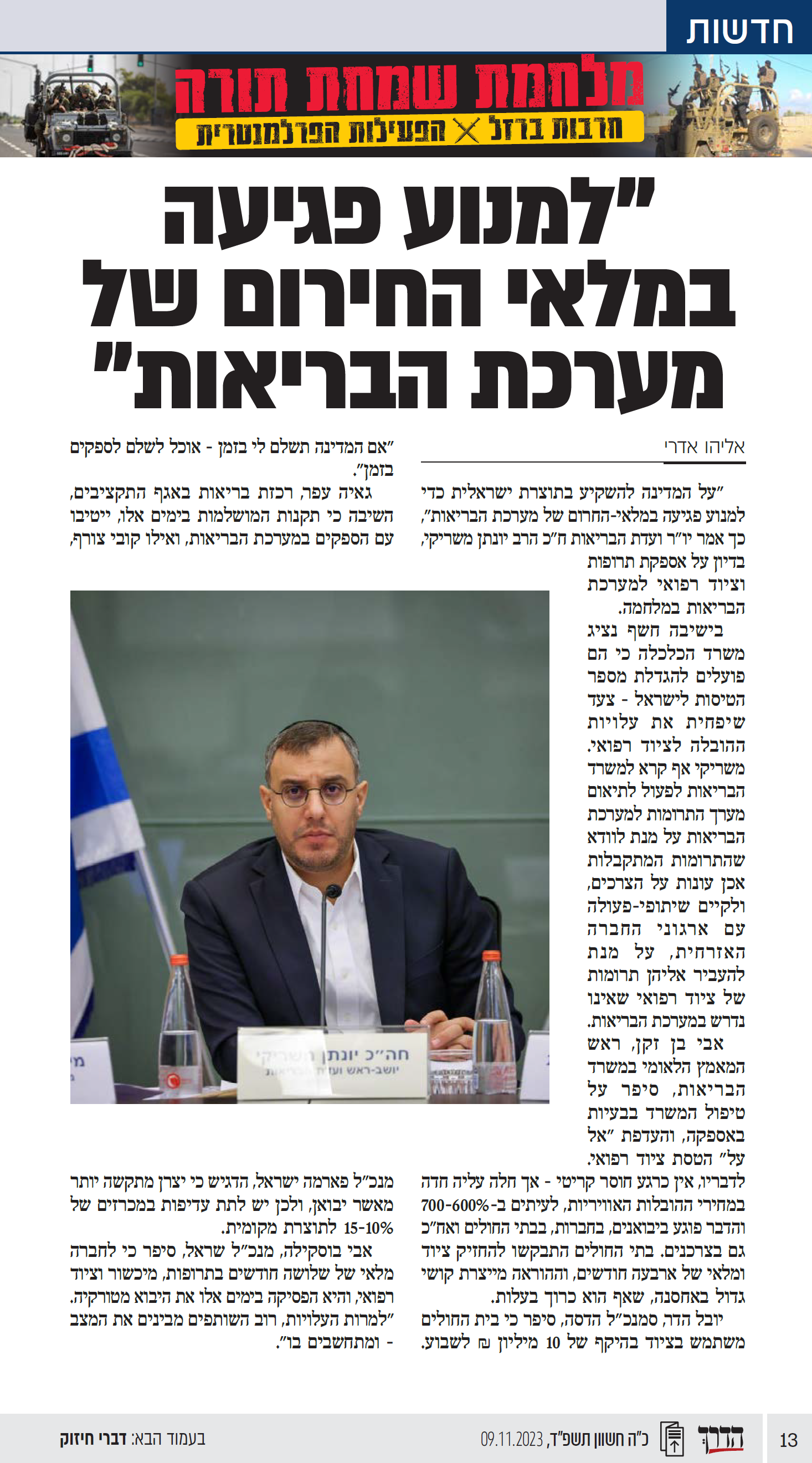 בעיתון 'הדרך' פורסמו היום (ה) דבריו של יו"ר ועדת הבריאות ח"כ יונתן משריקי כי "על המדינה להשקיע בתוצרת ישראלית כדי למנוע פגיעה במלאי-החרום של מערכת הבריאות", כך אמר בדיון על אספקת תרופות וציוד רפואי למערכת הבריאות במלחמה.