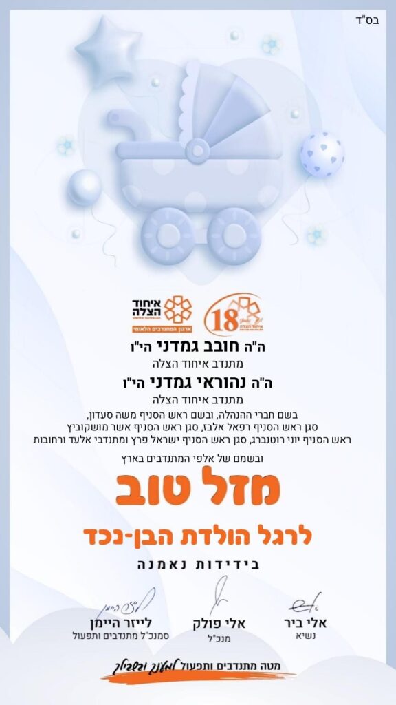 עוד משמחת הברית במעונו של ראש המוסדות שליט"א: ראשי 'איחוד הצלה' שיגרו ברכות חמות ולבביות, לחתנא דבי נשיאה, הרב נהוראי גמדני, ולאביו הרב חובב שליט"א, לרגל השמחה השרויה במעונם. גם אנחנו מצטרפים ומברכים בכל לב…