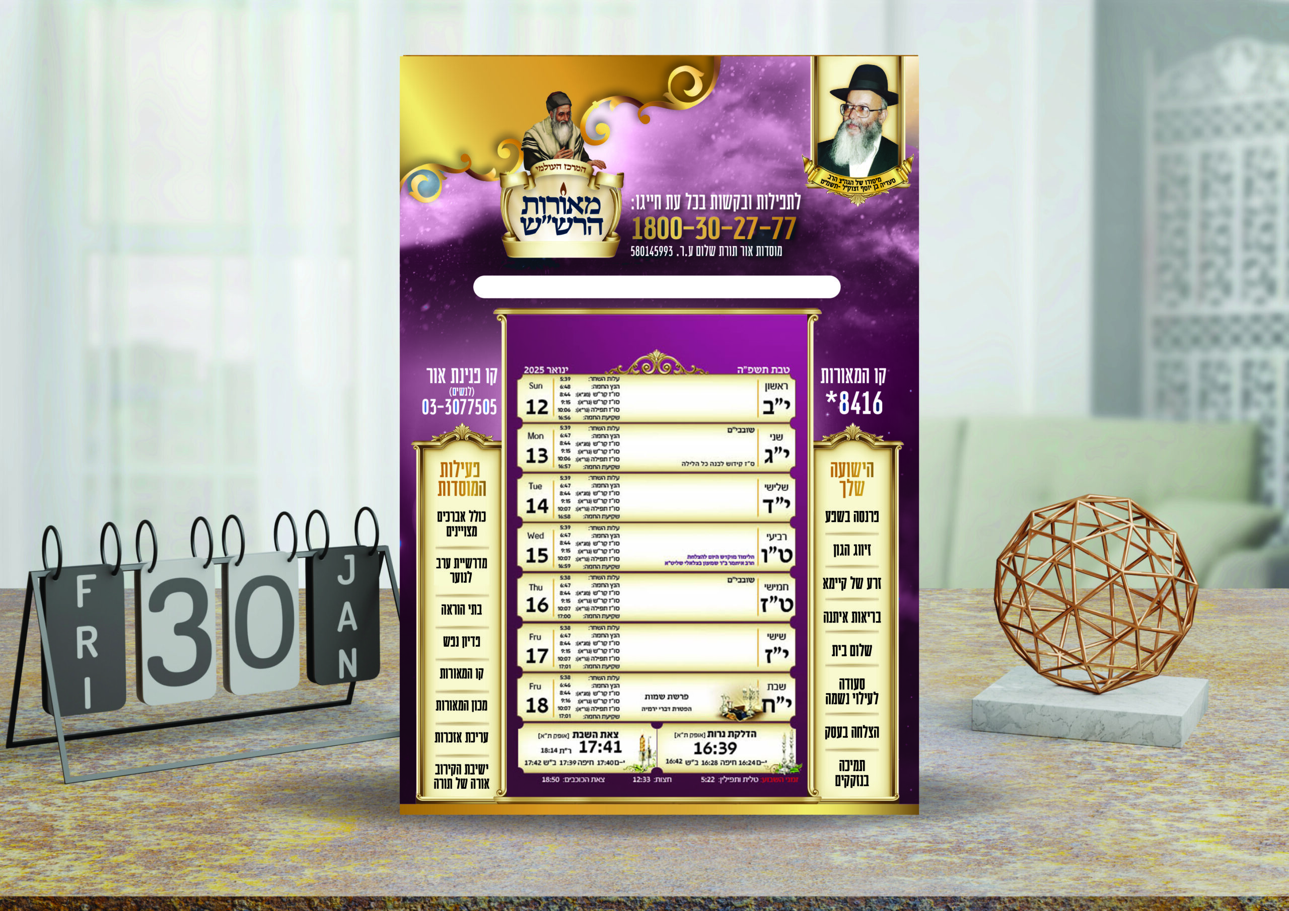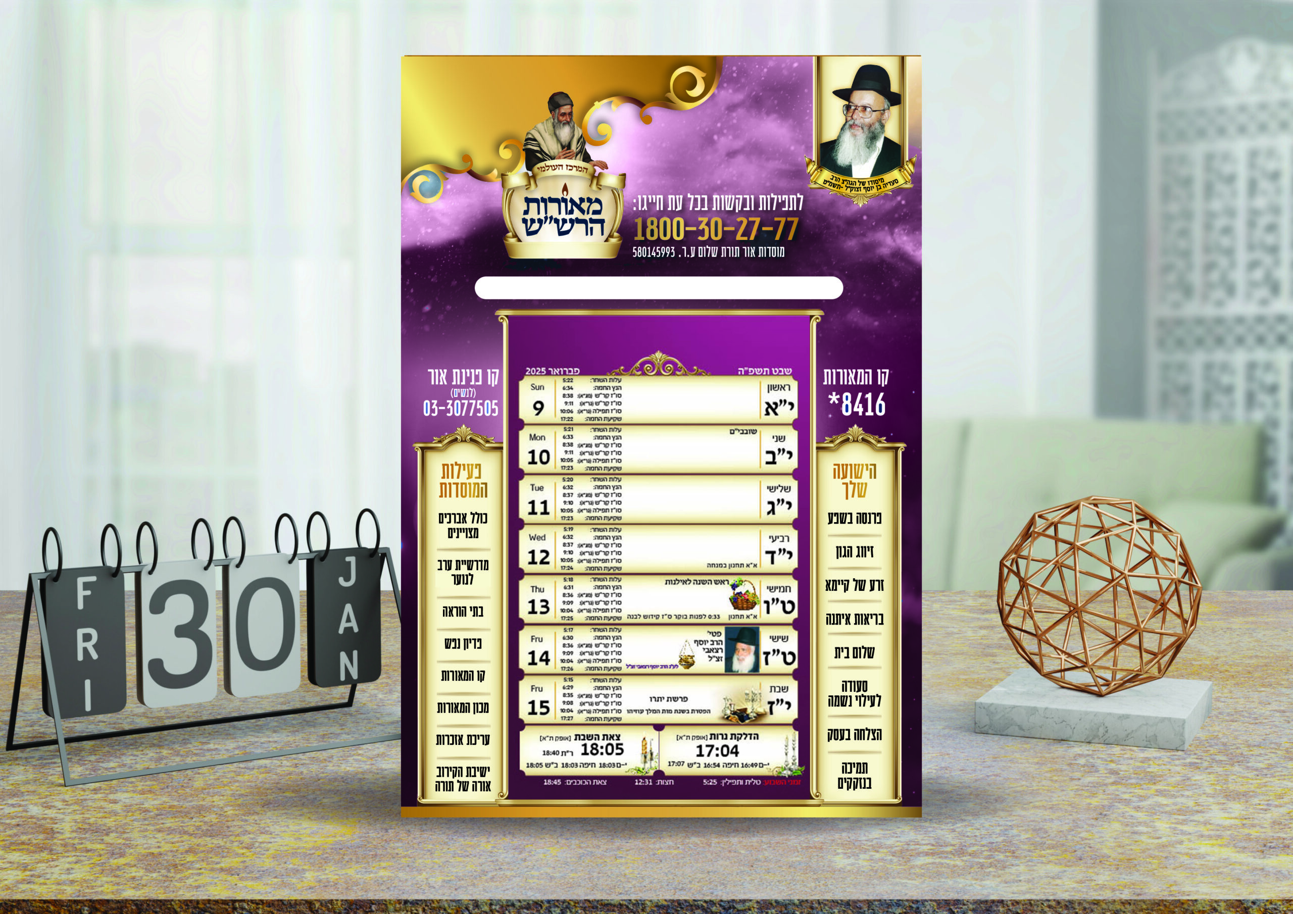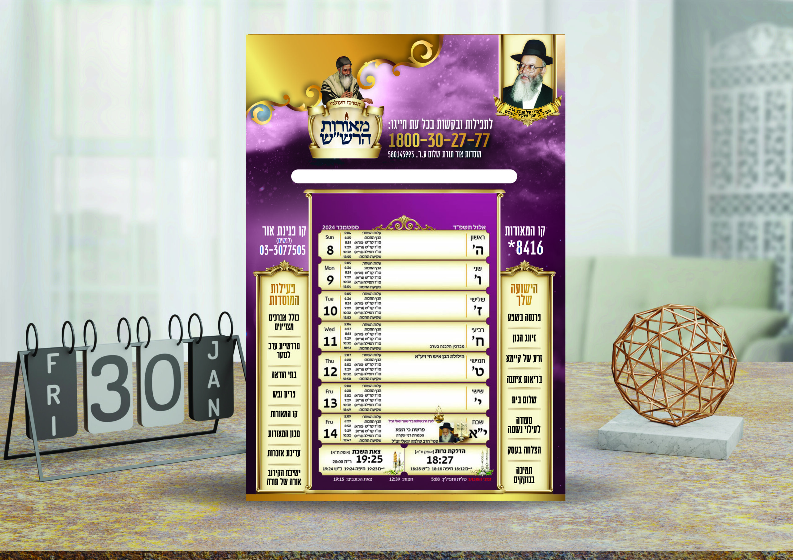 אנחנו נמצאים בסיעתא דשמיא עצומה, בעיצומה של מלאכת הכנת לוח השנה של 'המאורות' לשנת ה'תשפ"ה, מחודש ומפואר – שבעזרת ה' יודפס באלפי עותקים ויוענק לכם בהוקרה רבה.
