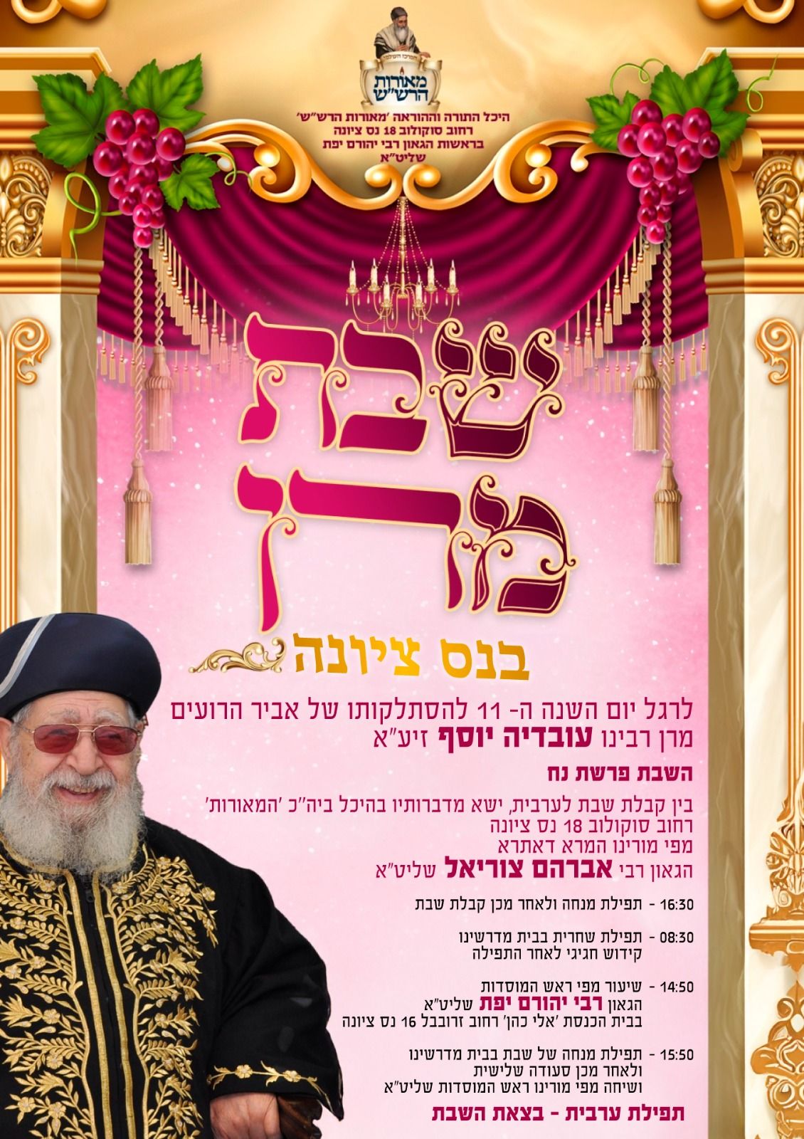 הננו שמחים לבשר לקהל הרחב כי לרגל יום השנה להסתלקותו של מרן אביר הרועים רבינו עובדיה יוסף זצוק"ל, נציין בהיכל בית הכנסת ובית המדרש 'מאורות הרש"ש' – רח' סוקולוב 18 נס ציונה את 'שבת מרן', בה נעלה את זכרו הטהור, נתבונן בהליכותיו ונלמד מתורתו.
