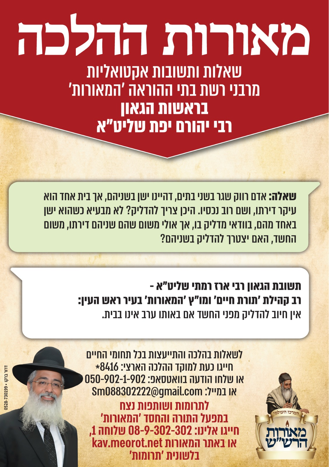 ניתן לשלוח שאלות לרבני בית ההוראה גם דרך האתר או באמצעות המייל: sm088302222@gmail.com