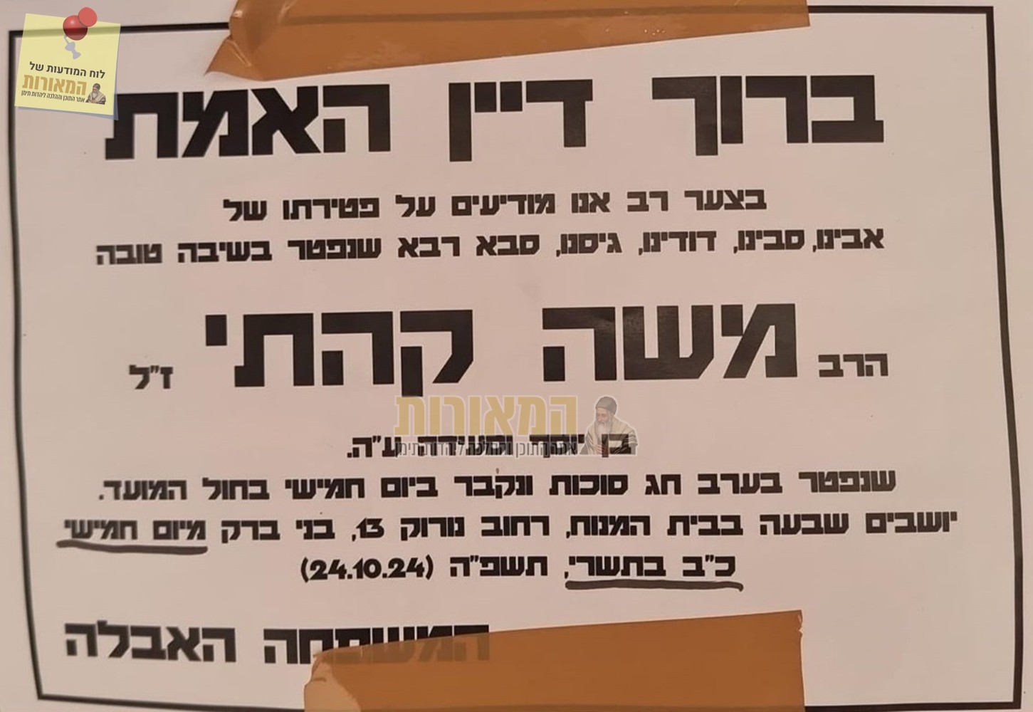 בני ק"ק מעדת תימן שבשכונת פרדס כץ בבני ברק, התבשרו בכאב על הסתלקותו של אחד מבני החבורה, יתיב וגריס באורייתא ולא מחזיק טיבותיה לנפשיה, עמד כל חייו לשמר בקנאות את מסורת יהדות תימן המפוארה, והעמיד דור ישרים יבורך רבי משה קהתי ז"ל, אשר השיב את נשמתו זכה לבוראו זקן ושבע ימים והוא בן צ"ו שנים בפטירתו.