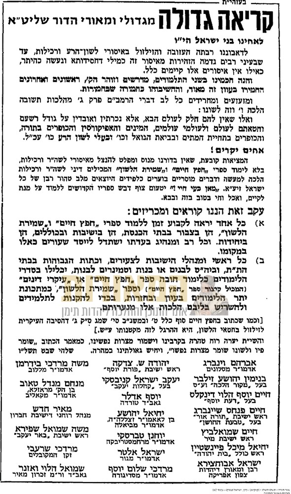 נסמיך לכך קריאת קודש משנת תשל"ו שעליה חתום רבנו מרדכי שרעבי לצד גדולי ראשי הישיבות, רבנים ואדמו"רים, לחיזוק נשגב בשמירת הלשון ובלימוד הלכותיה: