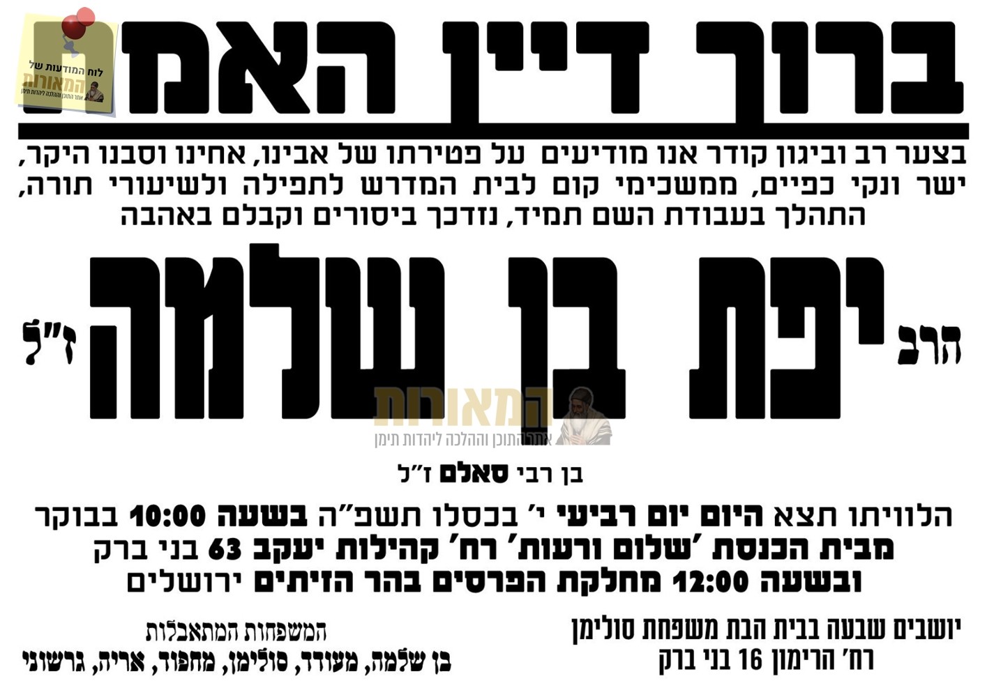 בשורה לא טובה הגיעה, על פטירתו של האי גברא רבה ויקירא, צנוע ומעלי, גאון בשתיקה, יקר יקרים, איש תם וישר וסר מרע, הרב הצדיק רבי יפת בן שלמה זצ"ל, והוא בן 88 שנים.