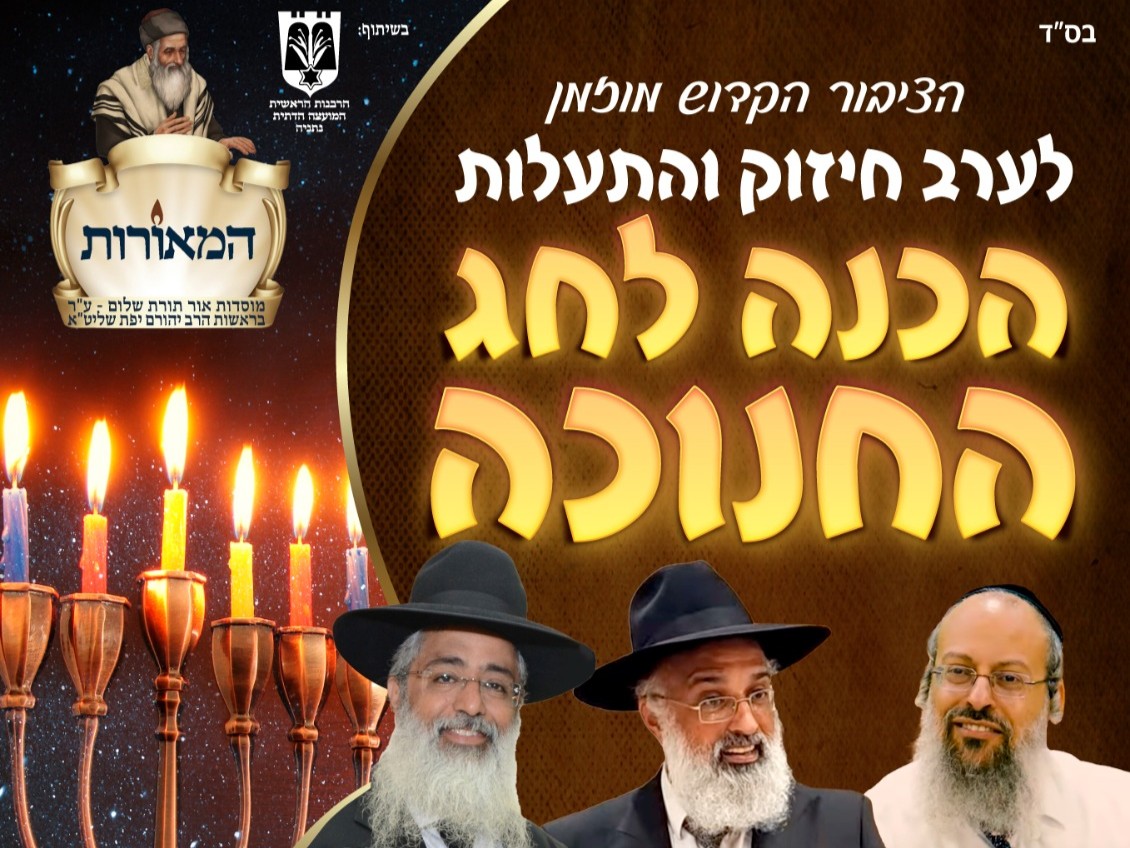 מוסדות 'המאורות' בשיתוף הרבנות הראשית והמועצה הדתית נתניה, שמחים להזמין את הציבור הקדוש לערב חיזוק והתעלות כהכנה לקראת חג החנוכה הבעל"ט, בהשתתפות מו"ר ראש המוסדות הגאון רבי יהורם יפת שליט"א, הגאון רבי ארז רמתי שליט"א והגאון רבי שי עטרי שליט"א.