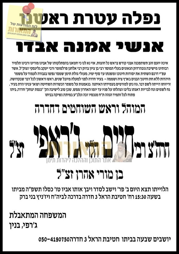 אבל בעדת תימן: מהעיר חדרה הגיעה הבשורה המרה על פטירתו של שריד לדור דעה, איש האשכולות הרב הצדיק מארי חיים הלוי ג'ראפי זצ"ל – ראש השוחטים ורב בית המטבחיים האיזורי רבות בשנים, ומוהל מומחה אשר זכה להכניס תינוקות רבים בבריתו של אאע"ה.