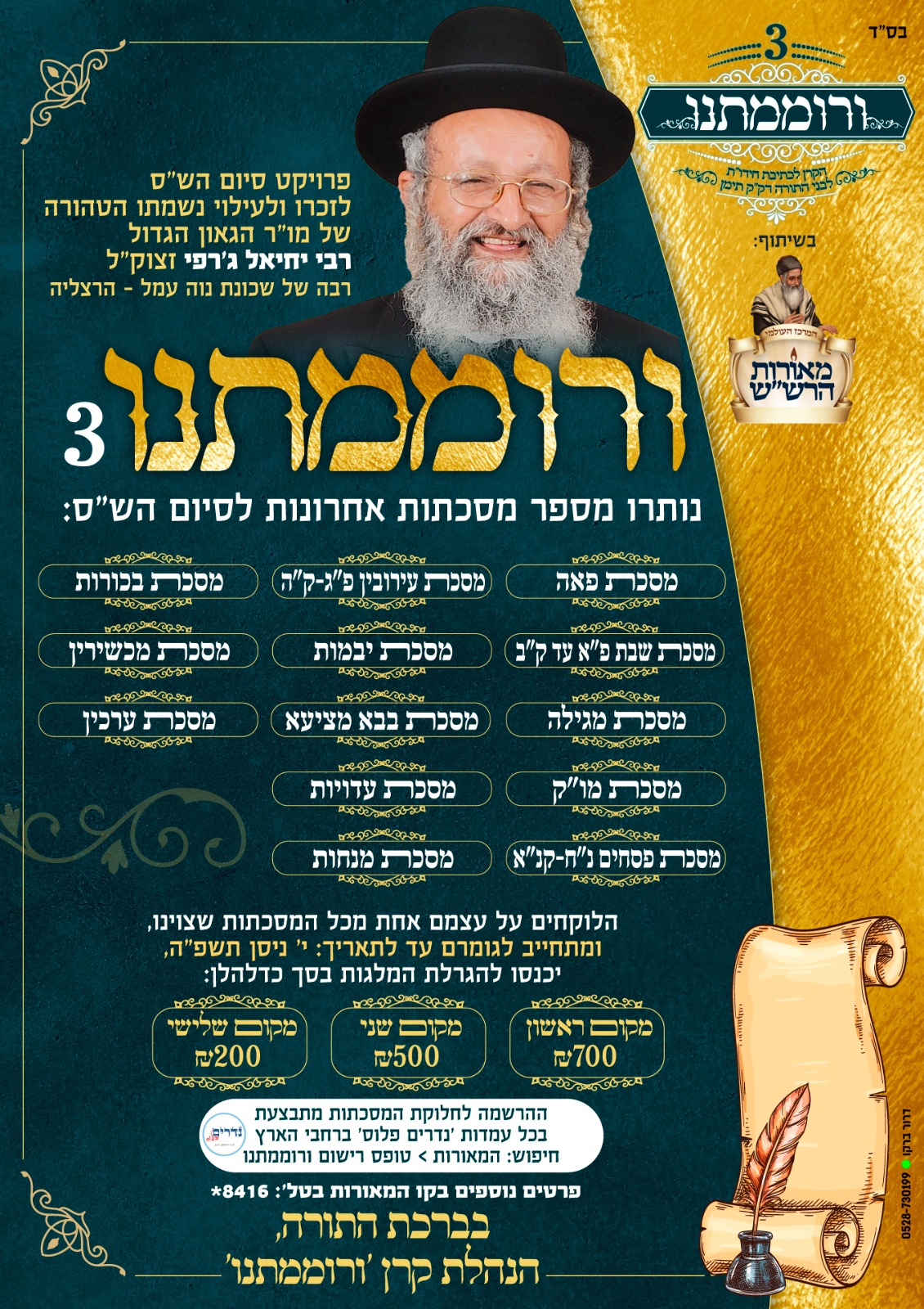 קרן 'ורוממתנו' לעידוד הלימוד וכתיבת חידושי תורה שע"י מוסדות 'המאורות' בהודעה חשובה לציבור בני התורה, כי נותרו מספר מסכתות אחרונות לסיום הש"ס שנלמד בצוותא על ידי בחורי הישיבות ואברכי הכוללים, לע"נ ולזכרו של הגה"צ רבי יחיאל ג'רפי זצ"ל – רבה של 'נוה עמל' הרצליה.