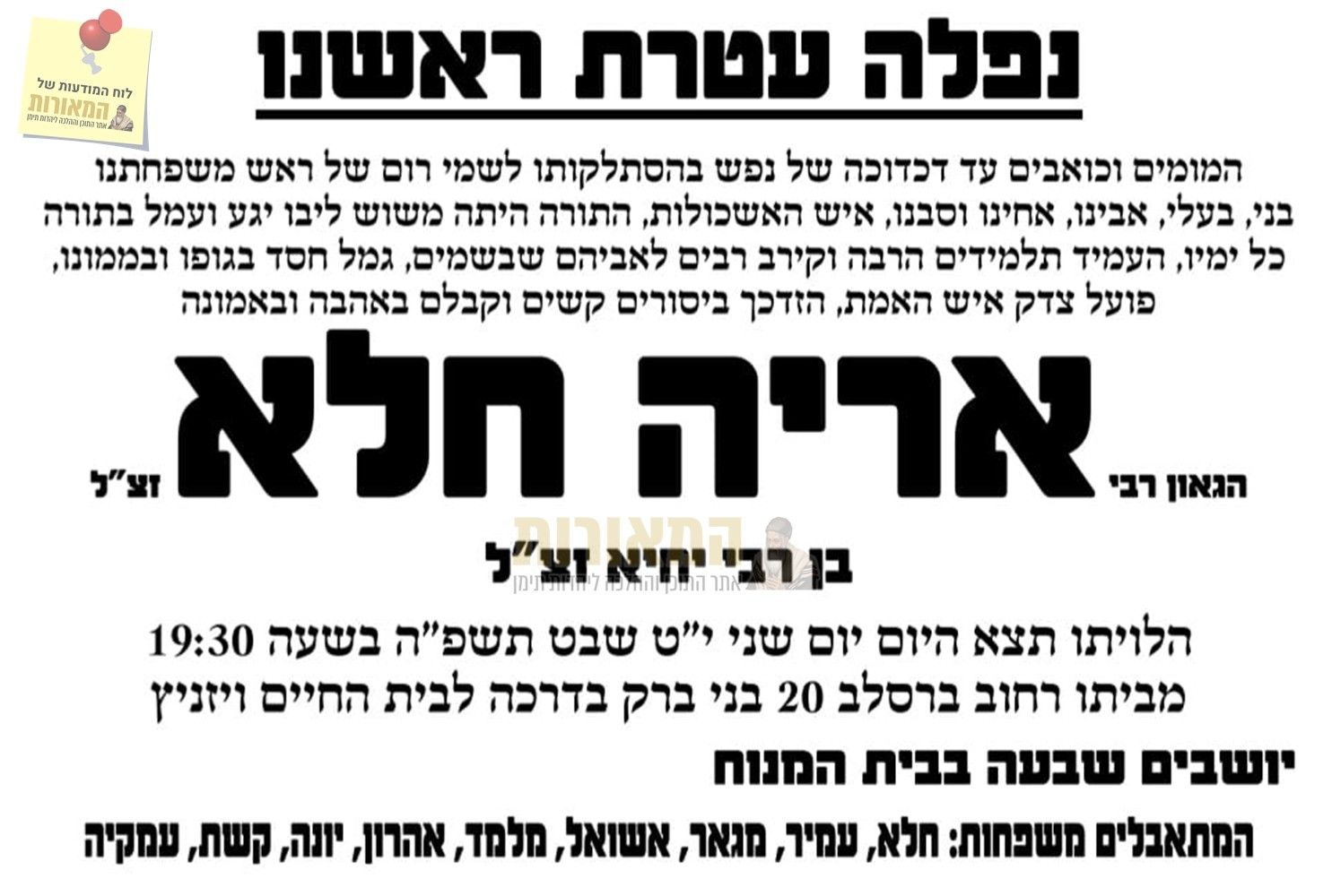 יושבים שבעה בבית המנוח זצ"ל – רח' ברסלב 20.