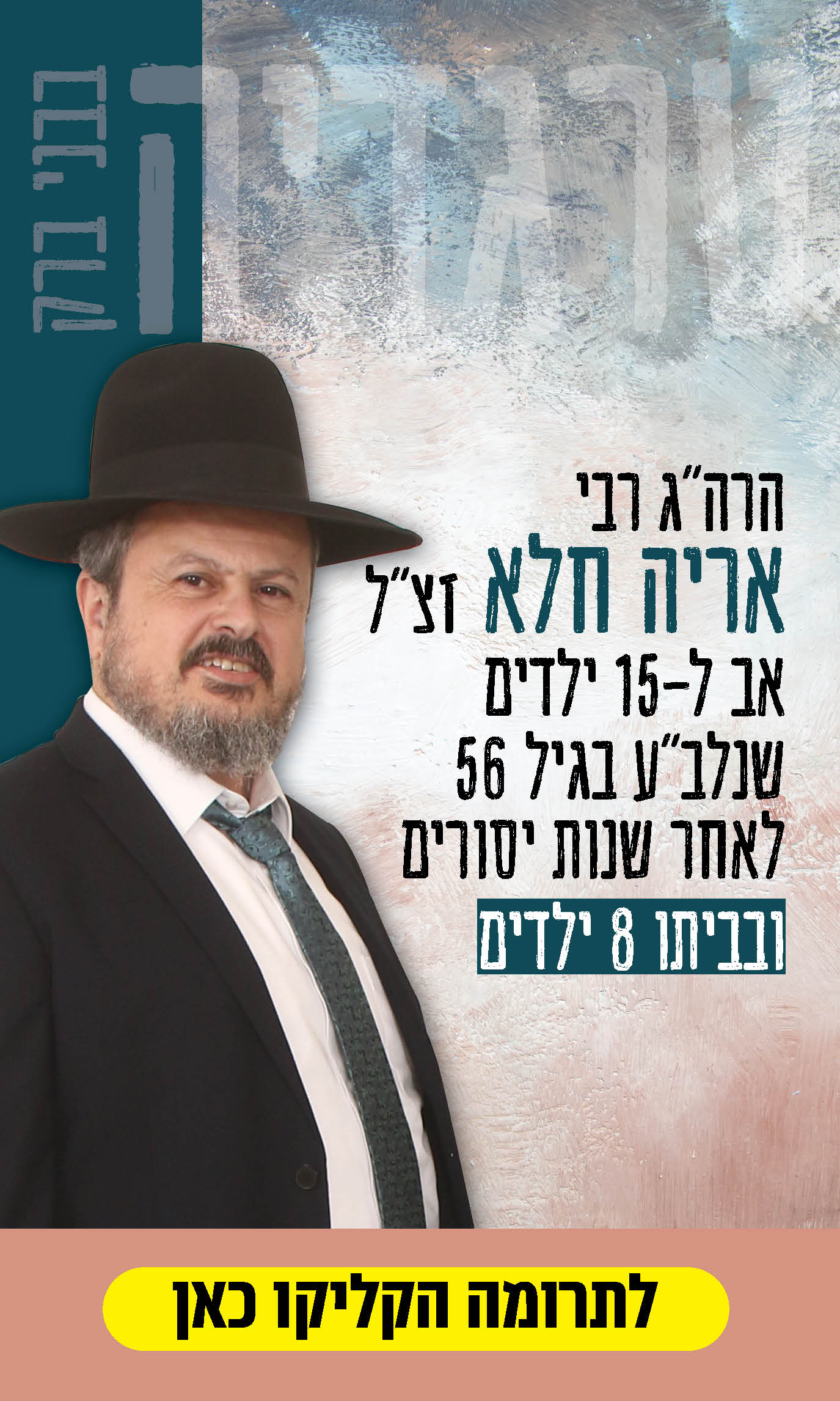 רבי אריה חלא זצ"ל, אב ל-15 – תלמיד חכם ומזכה הרבים, נפטר לאחר מאבק ממושך במחלה הקשה * התמסר להפצת תורה עד הרגע האחרון, גם כשהרופאים התייאשו * האלמנה נותרה עם 8 ילדים לא נשואים * כאשר הילד האחרון הגיע מהישיבה, יצאה נשמתו בטהרה