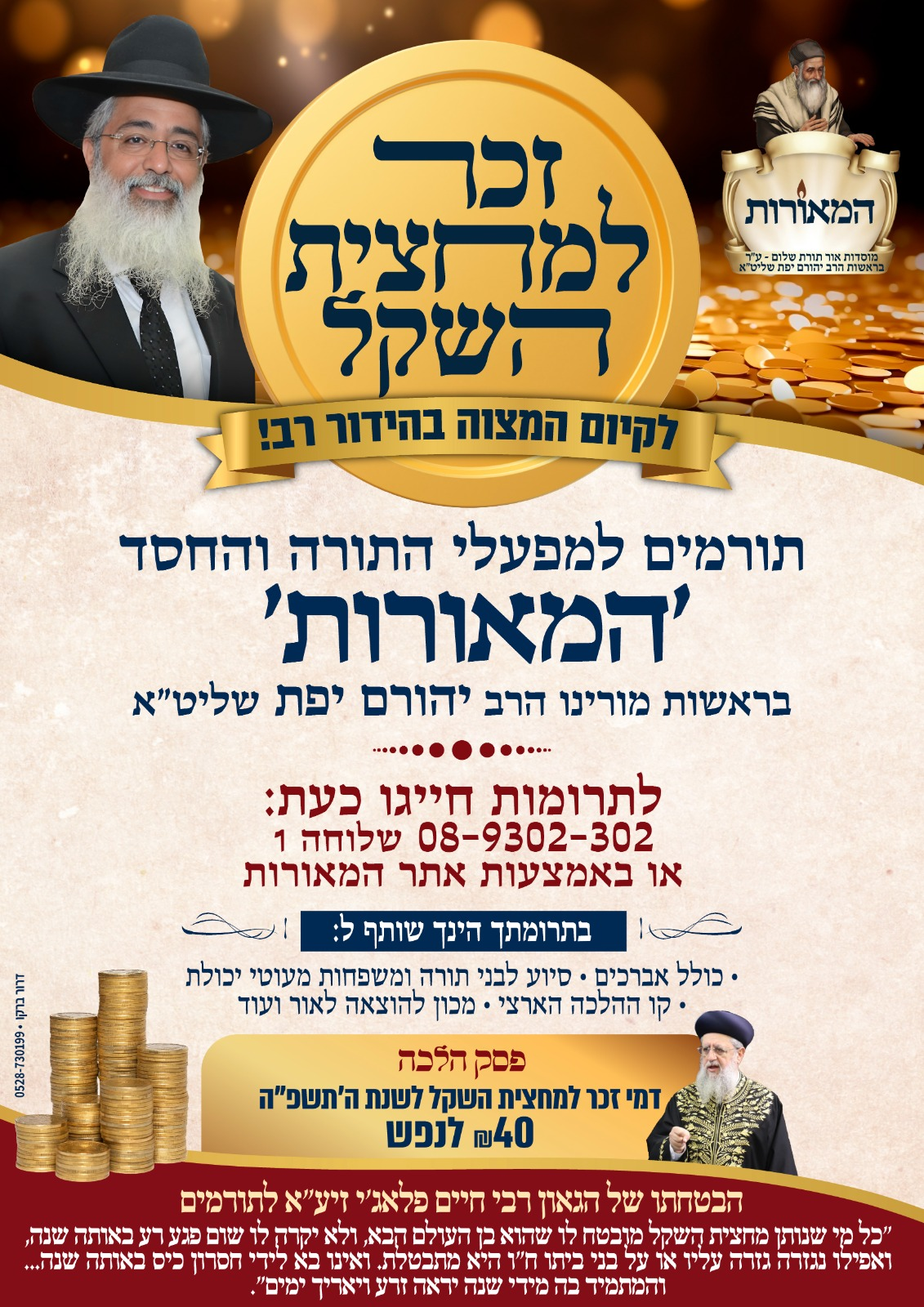 לשאלת רבים: גם השנה ניתן להעביר מעות 'זכר למחצית השקל' ו'מתנות לאביונים', שיועברו על ידי מו"ר הגאון רבי יהורם יפת שליט"א בשליחותכם לבני תורה ומשפחות נזקקות, ותזכו לקיים את המצוות בהידור ובשלימות – וגם: הגאונים הצדיקים הגדולים והמקובלים רבי יפת טיירי ורבי שמעוני בצלאלי שליט"א יעתירו בעדכם למילוי כל משאלות ליבכם לטובה, בעיצומו של יום פורים הקדוש והמסוגל לכל הישועות!
