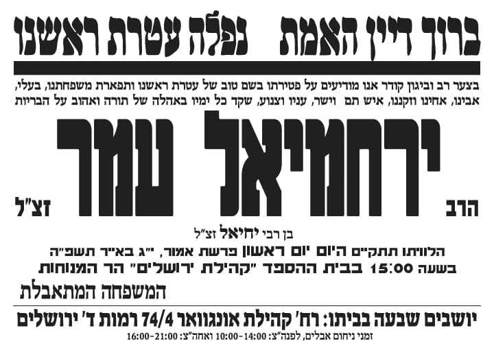 אבל כבד ירד בעדת תימן בפרט ובעיר ירושלים בכלל, עם הסתלקותו לשמי רום של הרב רבי ירחמיאל עמר זצ"ל, ב"ר יחיאל זצ"ל – בר אוריין ובר אבהן, אשר שימש דוגמה חיה ומופלאה למידות נעלות, ענווה אמיתית, וצניעות הליכות.