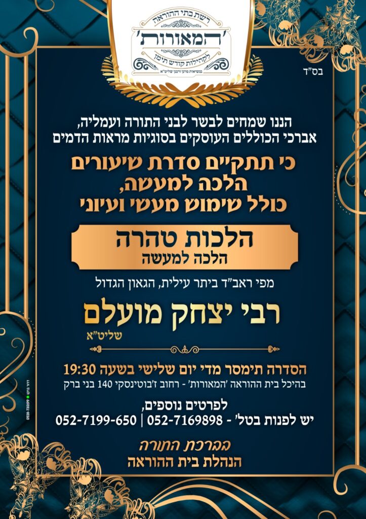 דף הבית » יהדות ואמונה » שיעורי טהרה 5: הגאון הגדול רבי יצחק מועלם שליט"א – רבה של ביתר עילית | ליל כ"ג אייר תשפ"ה