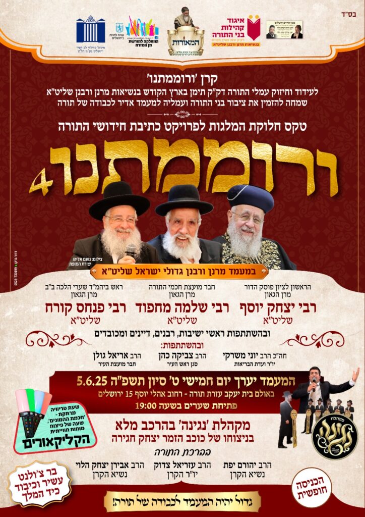 קרן 'ורוממתנו' לעידוד וחיזוק עמלי התורה דק"ק תימן בשיתוף ארגון 'המאורות' שמחים להזמין את ציבור בני התורה למעמד הגדול 'ורוממתנו' – 4, לרגל חלוקת המלגות לעמלי התורה, מאות בני הישיבות הקדושים אשר השתתפו בתחרות כתיבת חידושי התורה במסגרת הפרויקט, במעמד מרנן ורבנן שליט"א ואישי ציבור, בליווי תזמורת ובר עשיר.