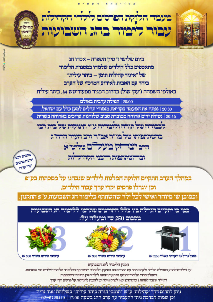 בראשות רב העיר הגאון הגדול רבי יצחק מועלם שליט"א, בביתר עילית התקיים כנס רב רושם לעשרות ילדי קהילות תימן כהוקרה על עמלם בחג השבועות. השתתפו כמו כן, הגאון רבי אבינועם שמואל יהב שליט"א – ר"מ ומרבני העיר, הגאון רבי אריה גברא שליט"א – ראש ישיבה ומרבני העיר. הערב התקיים ביוזמתו של איש חיל רב הפעלים לתורה ולתעודה, הרב יאיר יעיש שליט"א.