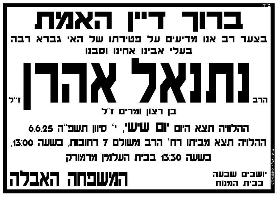 חבל על דאבדין ולאו משתכחין … מורי ורבי הגאון הרב נתנאל אהרון זצ״ל היה מלא שמחה ועליזות, ותענוג היה לשהות וללמוד במחיצתו, ליהנות מחיוכו וצחוקו ומכוחו העצום בלימוד התורה.