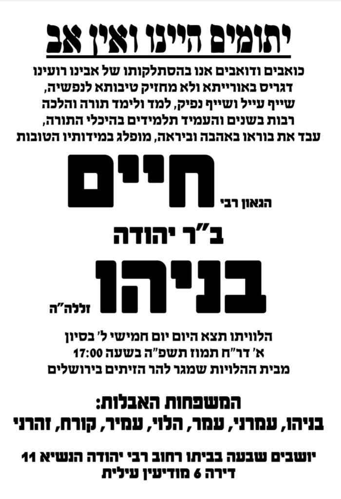 אבל כבד בעדת תימן בכלל ובעיר מודיעין עילית בפרט עם הסתלקותו לשמי רום של הגאון השקדן המופלג רבי חיים בניהו זצ"ל, מגדולי וחשובי תלמידי החכמים בדורינו.