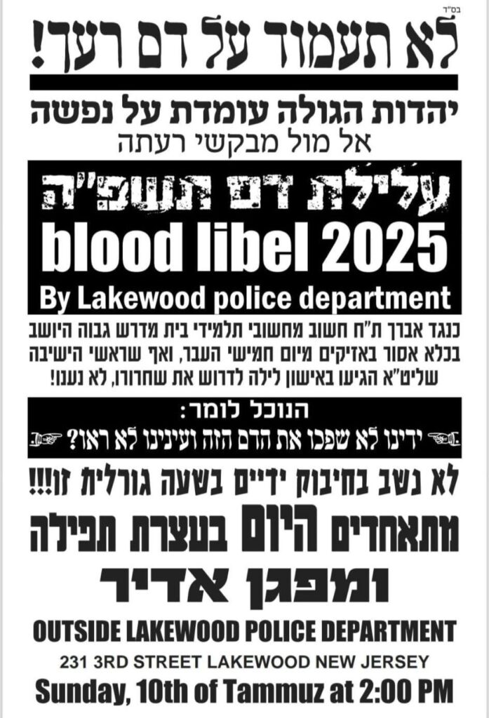 תמונת הפשקויל שפורסם בחוצות לייקווד – הקורא להשתתף בהפגנה נגד עלילת דמו של הרב כובני שליט"א