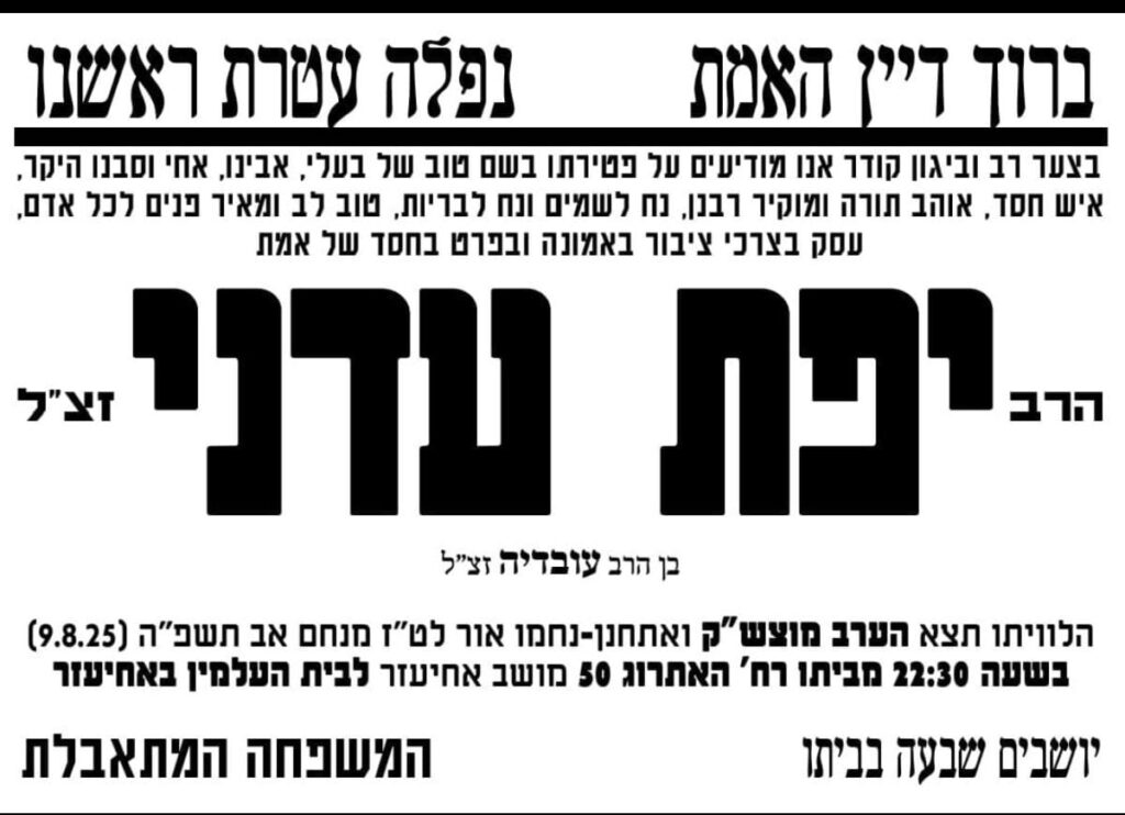 במוצאי שבת האחרון ט"ו מנחם אב, רבים ליוו למנוחת עולמים את השם הטוב, היקר באדם, שייף עייל שייף נפיק, הצדיק רבי יפת עדני זצ"ל, שהלך לבית עולמו בשיבה טובה.