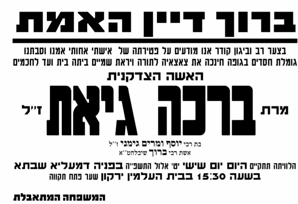 בני ברק: הלכה לעולמה האשה הצדקנית מרת ברכה גיאת ע"ה, אשת יבדל לחיים ארוכים רבי ברוך גיאת שליט"א – מעובדי עיריית בני ברק לשעבר.