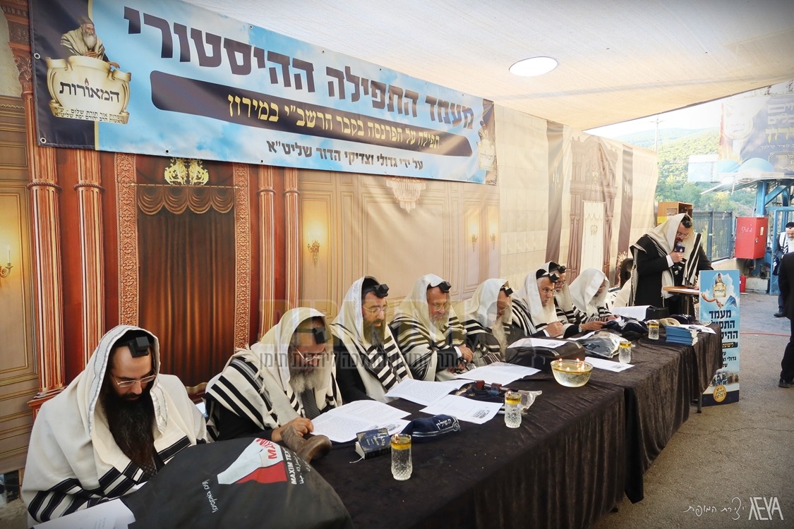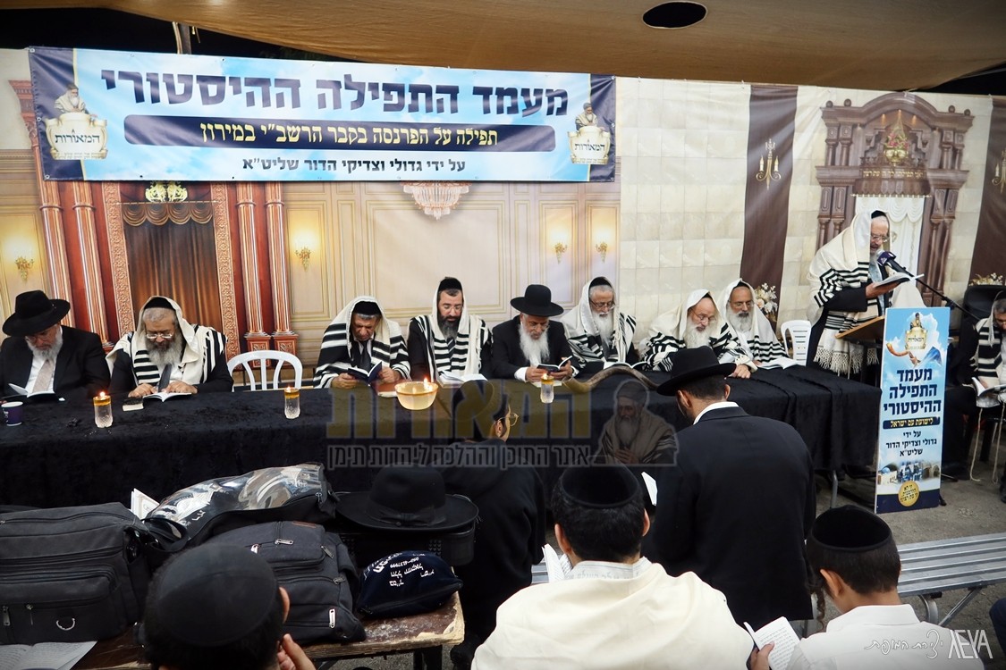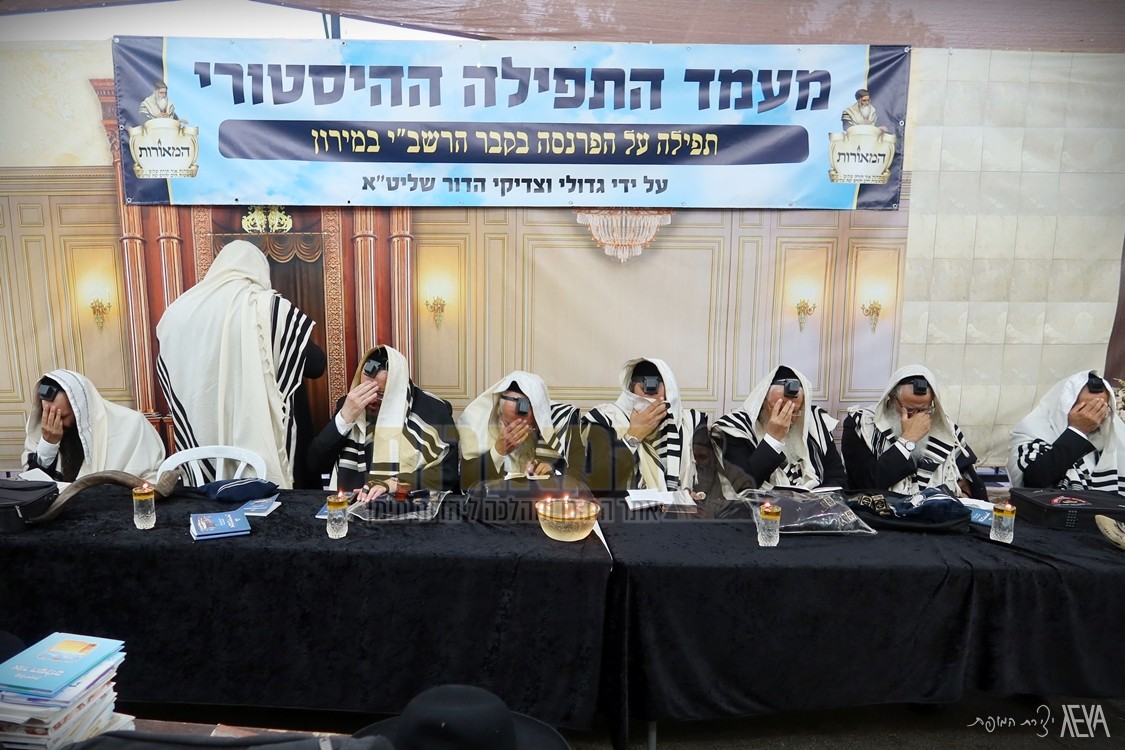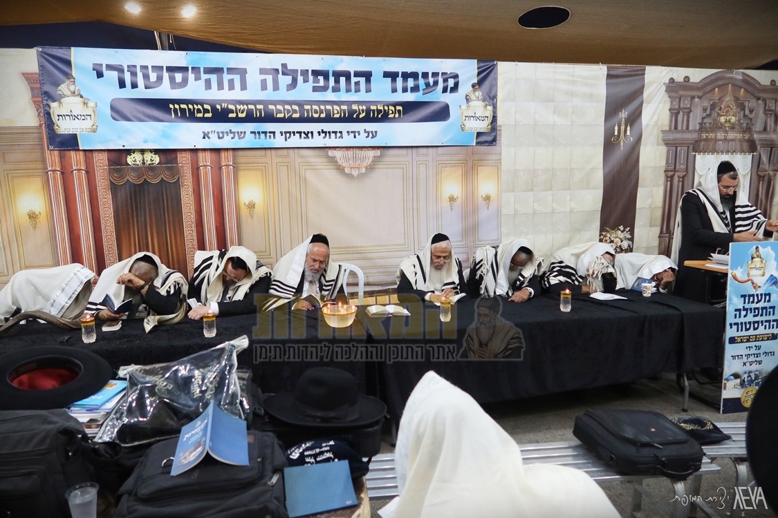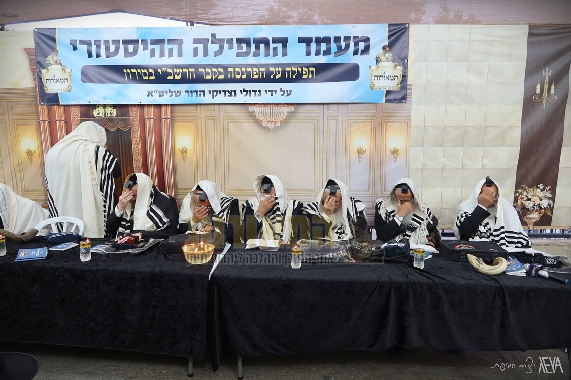 ויסעו מצפת ויחנו במירון, סמוך ונראה לציונו של התנא האלקי רבי שמעון בר יוחאי זי"ע שם התקיים מעמד ה'אשמורות' המרכזי כמסורת אבותינו, בהשתתפות ציבור גדול שהתאסף ובא מכל רחבי הארץ, וכן מתפללים מכל העדות והחוגים ששהו במקום והצטרפו גם הם. לפני התיבה עברו: הגרא"א יוחנן, הגר"מ אהרן, הגר"א רמתי והגר"א גברא. לאחר מכן התפללו שחרית כוותיקין, בהנץ החמה, כשלפני התיבה עובר הגר"ג חסיד. בסיום תפילת השחר נאמרה ה"תפילה על הפרנסה" עבור כלל ישראל ובפרט לתורמי 'המאורות', כשלפני התיבה עובר הגר"ע צדוק, והמעמד נחתם בתקיעת שופר על ידי הגר"א רמתי.