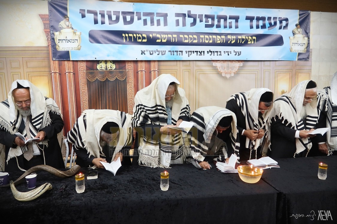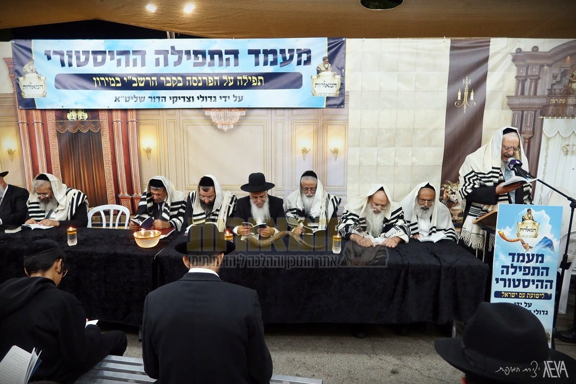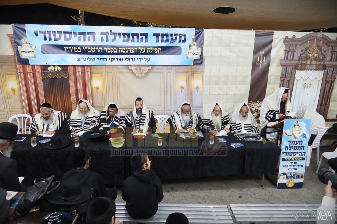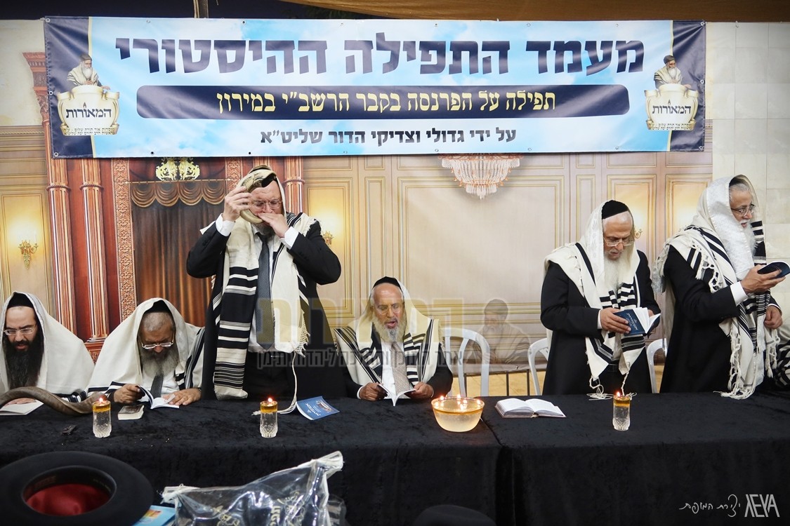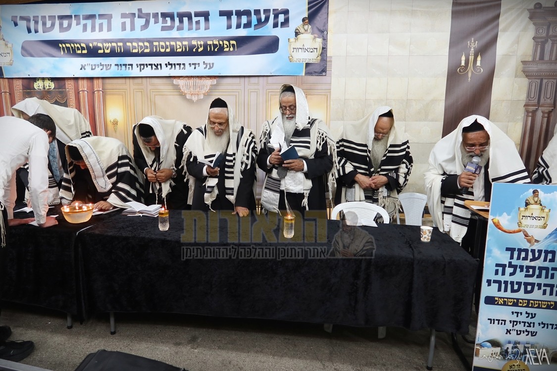 ויסעו מצפת ויחנו במירון, סמוך ונראה לציונו של התנא האלקי רבי שמעון בר יוחאי זי"ע שם התקיים מעמד ה'אשמורות' המרכזי כמסורת אבותינו, בהשתתפות ציבור גדול שהתאסף ובא מכל רחבי הארץ, וכן מתפללים מכל העדות והחוגים ששהו במקום והצטרפו גם הם. לפני התיבה עברו: הגרא"א יוחנן, הגר"מ אהרן, הגר"א רמתי והגר"א גברא. לאחר מכן התפללו שחרית כוותיקין, בהנץ החמה, כשלפני התיבה עובר הגר"ג חסיד. בסיום תפילת השחר נאמרה ה"תפילה על הפרנסה" עבור כלל ישראל ובפרט לתורמי 'המאורות', כשלפני התיבה עובר הגר"ע צדוק, והמעמד נחתם בתקיעת שופר על ידי הגר"א רמתי.