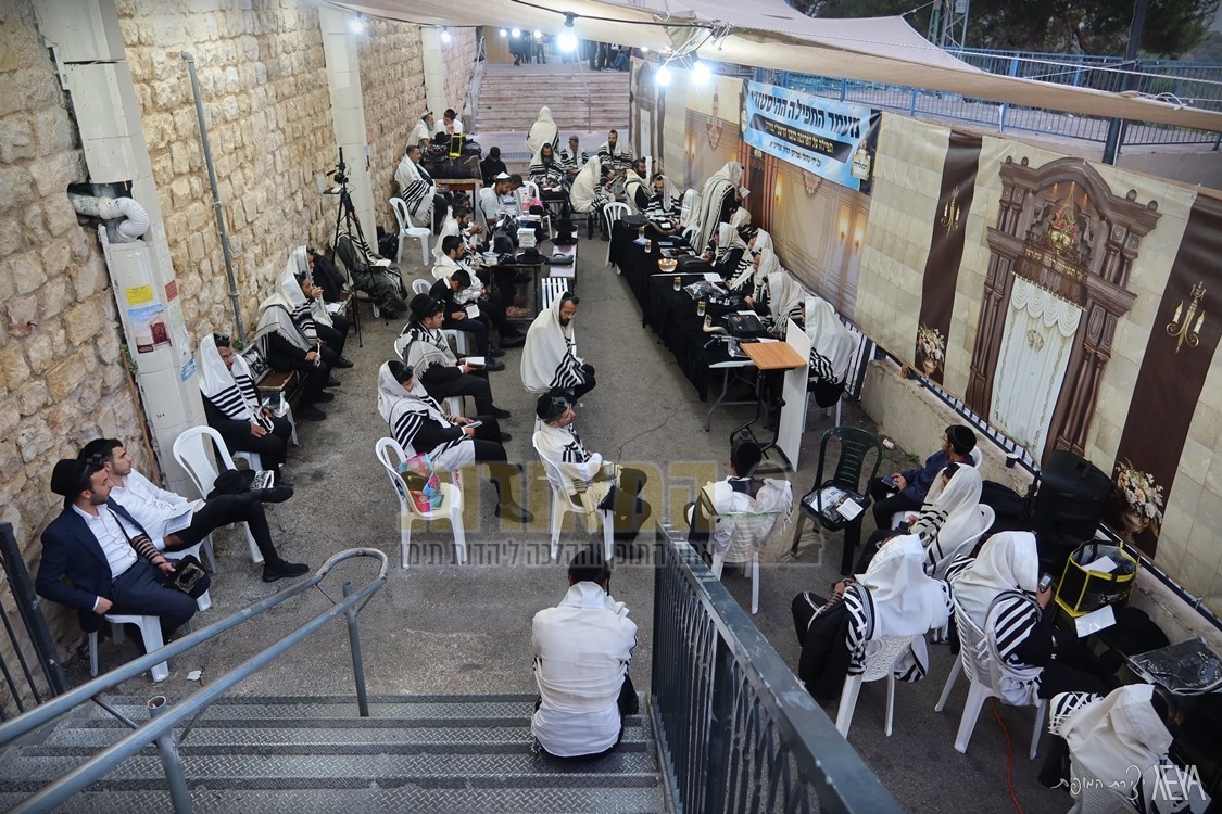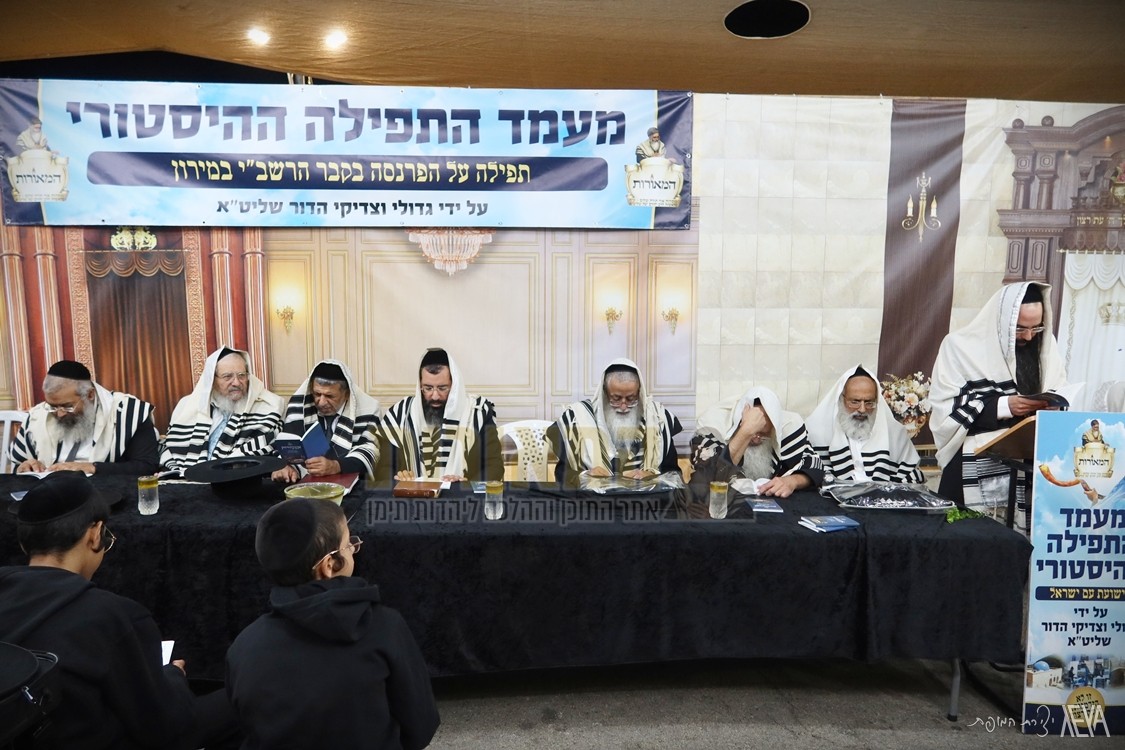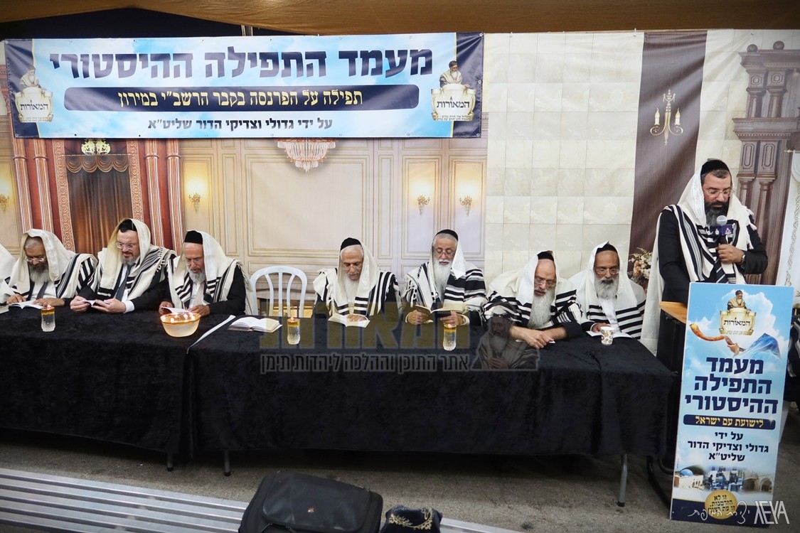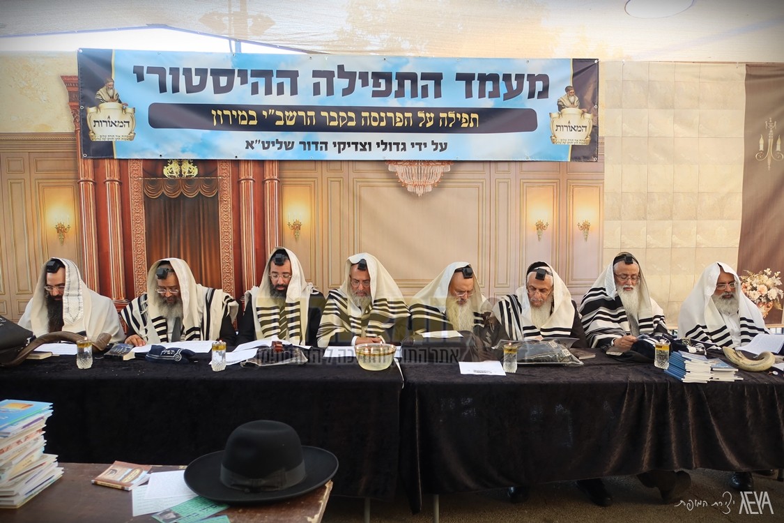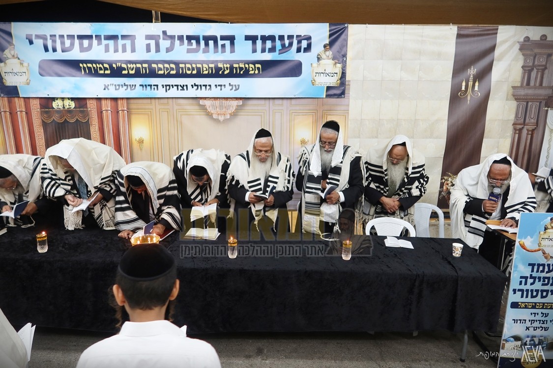 ויסעו מצפת ויחנו במירון, סמוך ונראה לציונו של התנא האלקי רבי שמעון בר יוחאי זי"ע שם התקיים מעמד ה'אשמורות' המרכזי כמסורת אבותינו, בהשתתפות ציבור גדול שהתאסף ובא מכל רחבי הארץ, וכן מתפללים מכל העדות והחוגים ששהו במקום והצטרפו גם הם. לפני התיבה עברו: הגרא"א יוחנן, הגר"מ אהרן, הגר"א רמתי והגר"א גברא. לאחר מכן התפללו שחרית כוותיקין, בהנץ החמה, כשלפני התיבה עובר הגר"ג חסיד. בסיום תפילת השחר נאמרה ה"תפילה על הפרנסה" עבור כלל ישראל ובפרט לתורמי 'המאורות', כשלפני התיבה עובר הגר"ע צדוק, והמעמד נחתם בתקיעת שופר על ידי הגר"א רמתי.