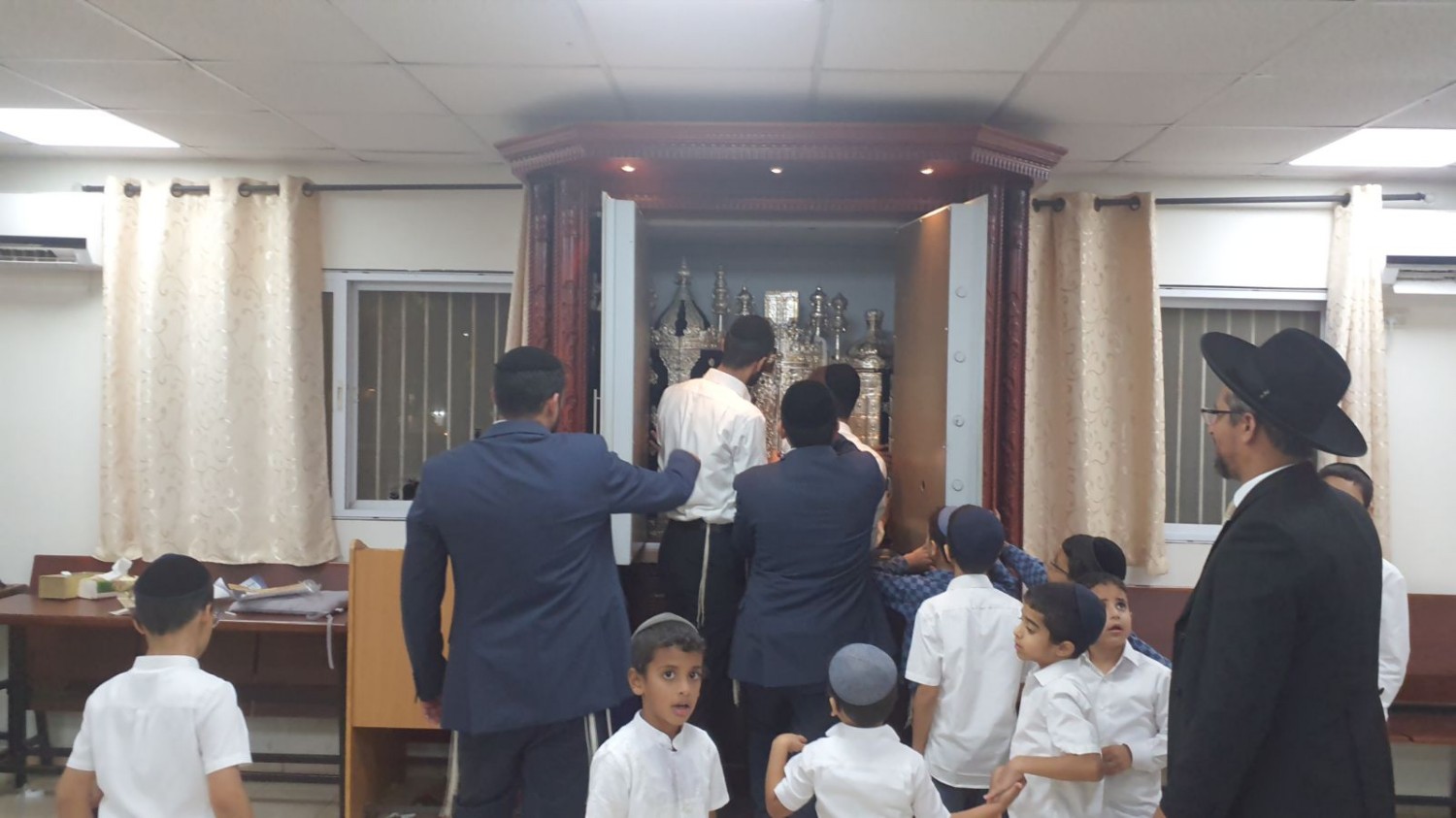 במרחק כמה מטרים משם, בבית הכנסת המרכזי 'חמדת שמעון' רקד המוהל הידוע, הגאון רבי יחיאל קארו שליט"א לקול שירתו של הזמר יצחק חגירה.