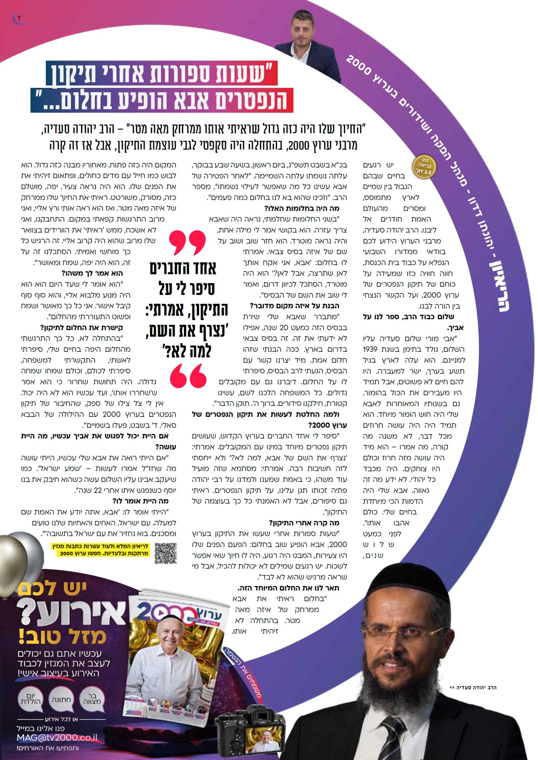 מזכה הרבים הרה"ג רבי יהודה סעדיה שליט"א – מרבני 'ערוץ 2000', מספר בריאיון על חלום מסעיר והסוף המרגש: