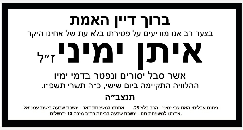 בצער רב התקבלה הידיעה על פטירתו של ר' איתן (ב"ר שלום) ימיני ז"ל, תושב עמנואל, לאחר שנים שנזדכך ביסורים קשים ומרים, והוא בן 63 בפטירתו.