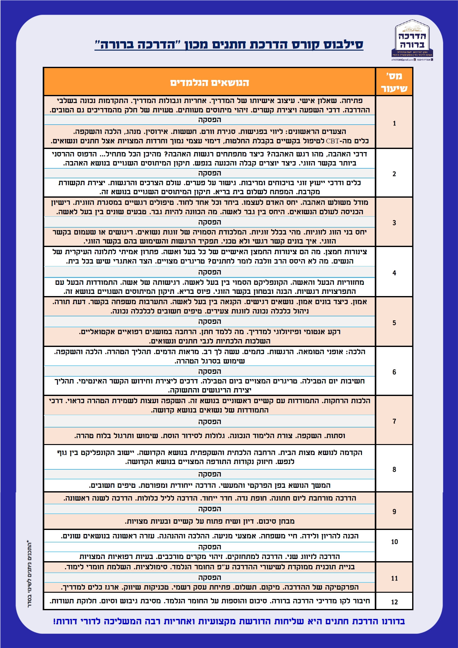 בשורה משמחת: לאור הביקוש, נפתחה ההרשמה לקורס להכשרת מדריכי חתנים, משולב עם כלים מעולם הטיפול – קורס יחיד מסוגו, מקצועי ועשיר בכלים וטכניקות להתפתחות והעצמה אישית וזוגית מעבר להתמחות בהדרכת חתנים.