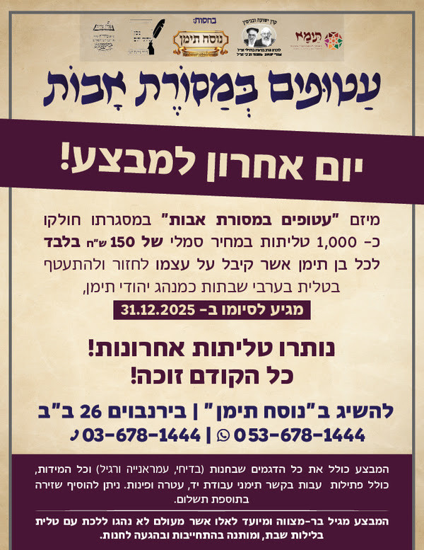 שימו לב: היום, י"א בטבת התשפ"ו (31.12 למנינם) זהו היום האחרון למבצע 'הגדול של 'עטופים במסורת אבות', במסגרתו חולקו כבר למעלה מ-1,000(!) טליתות תימניות מהודרות מכל הדגמים, כולל פתילות וקשירה וכן פינות ועטרה, במחיר מסובסד של 150 ש"ח בלבד, לבני העדה אשר קיבלו על עצמם לשוב למנהג אבותינו ולהתעטף בטלית בלילות שבת מכאן והלאה.