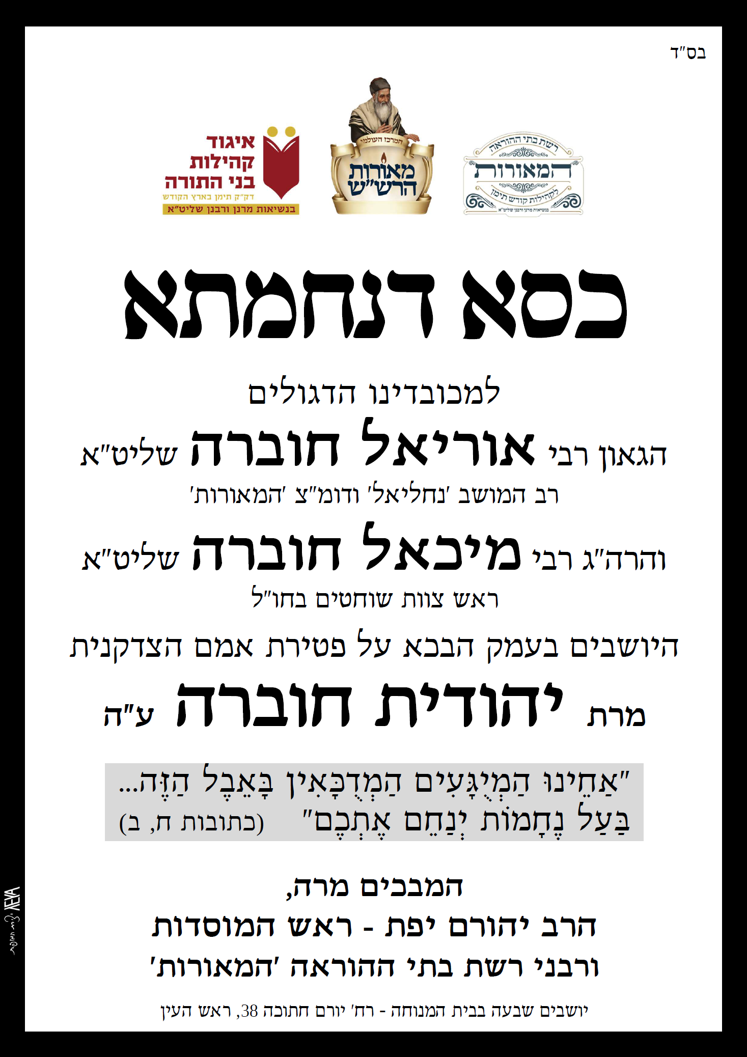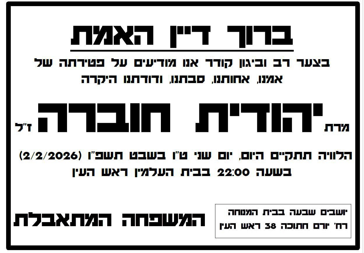 בראש העין ליוו למנוחות ביום שני שעבר, ט"ו בשבט, את האשה הצדקנית מרת יהודית חוברה ע"ה (אלמנת רבי ישעיה זצ"ל שנלב"ע לפני כשנתיים), שהשיבה נשמתה לכור מחצבתה בשיבה טובה.