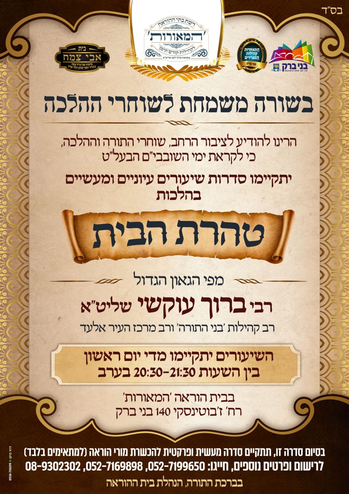 דף הבית » שיעורי תורה » שובבי"ם תשפ"ו: סדרת השיעורים בהלכות טהרה • שיעור שישי | הרב ברוך עוקשי