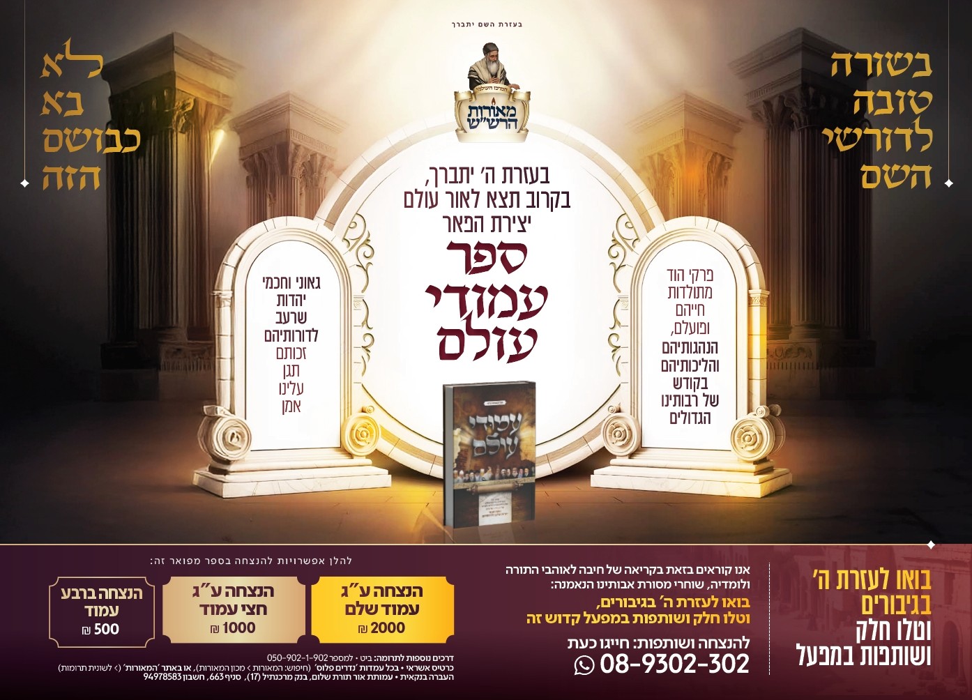 גם השנה ניתן להעביר מעות 'זכר למחצית השקל' ו'מתנות לאביונים', שיועברו על ידי מו"ר הגאון רבי יהורם יפת שליט"א בשליחותכם לבני תורה ומשפחות נזקקות, ותרוויחו בכפליים: גם תקיימו את המצוות בהידור ובשלימות וגם תזכו לברכה שיתמלאו כל משאלות ליבכם לטובה!