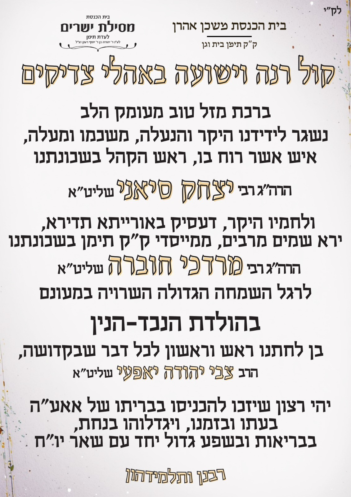 ברכת מזל טוב להרה"ג רבי יצחק סיאני שליט"א ולחותנו הרה"ג רבי מרדכי חוברה שליט"א לרגל הולדת הנכד-הנין בשטו"מ, בן לחתנו הרב צבי יהודה יאפעי, בן הרה"ג רבי יחיאל יפעי שליט"א ונכד הגאון רבי עובדיה יפעי שליט"א – מזקני רבני תימן, רב שכונת 'הדר יוסף' בתל אביב ורב ק"ק תימן באלעד. שמחת הברית תיערך אי"ה בעתו ובזמנו בשב"ק פרשת כי תשא – שבת פרה הבעל"ט, בק"ק 'מסילת ישרים' – בית וגן, ירושלים.